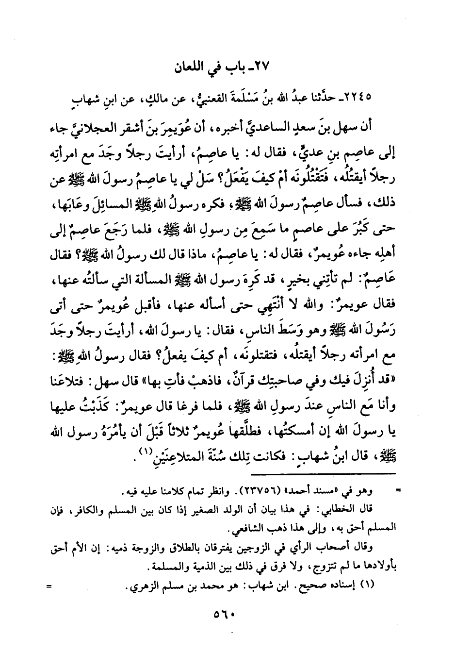 ٢٢٤٥ - حدَّثنا عبدُ الله بنُ مسلَمةَ القعنبيُّ، عن مالك، عن ابنِ شهابٍ أن سهل بنَ سعدٍ الساعديَّ أخبره، أن عُوَيمِرَ بنَ أشقر العجلانيَّ جاء إلى عاصِم بنِ عديٍّ، فقال له: يا عاصِمُ، أرأيتَ رجلاً وجَدَ مع امرأتِه رجلاً أيقتُلُه، فتقْتُلُونَه أمْ كيفَ يَفعَلُ؟ سَلْ لي يا عاصِمُ رسولَ الله - صلَّى الله عليه وسلم - عن ذلك، فسأل عاصِمٌ رسولَ الله - صلَّى الله عليه وسلم -، فكره رسولُ اللهِ - صلَّى الله عليه وسلم - المسائِلَ وعَابَها، حتى كَبُرَ على عاصمٍ ما سَمعَ مِن رسولِ الله - صلَّى الله عليه وسلم -، فلما رَجَعَ عاصِمٌ إلى أهلِه جاءه عُويمرٌ، فقال له: يا عاصِمُ، ماذا قال لك رسولُ الله - صلَّى الله عليه وسلم -؟ فقال عَاصِمٌ: لم تأتِني بخيرٍ، قد كَرِهَ رسول الله - صلَّى الله عليه وسلم - المسألة التي سألتُه عنها، فقال عويمرٌ: والله لا أنتَهِي حتى أسأله عنها، فأقبل عُويمرٌ حتى أتى رَسُولَ الله - صلَّى الله عليه وسلم - وهو وَسَطَ الناسِ، فقال: يا رسولَ الله، أرأيتَ رجلاً وجَدَ مع امرأته رجلاً أيقتلُه، فتقتلونَه، أم كيفَ يفعلُ؟ فقال رسولُ اللهِ - صلَّى الله عليه وسلم -: "قد أُنزِلَ فيك وفي صاحبتِك قرآنٌ، فاذهبْ فأتِ بها" قال سهل: فتلاعَنا وأنا مَع الناسِ عندَ رسولِ الله - صلَّى الله عليه وسلم -، فلما فرغا قال عويمرٌ: كَذَبْتُ عليها يا رسولَ الله إن أمسكتُها، فطلَّقها عُويمرٌ ثلاثاً قَبْلَ أن يأمُرَهُ رسول الله - صلَّى الله عليه وسلم -، قال ابنُ شهابٍ: فكانت تِلك سُنةَ المتلاعِنَيْنِ (¬١).
