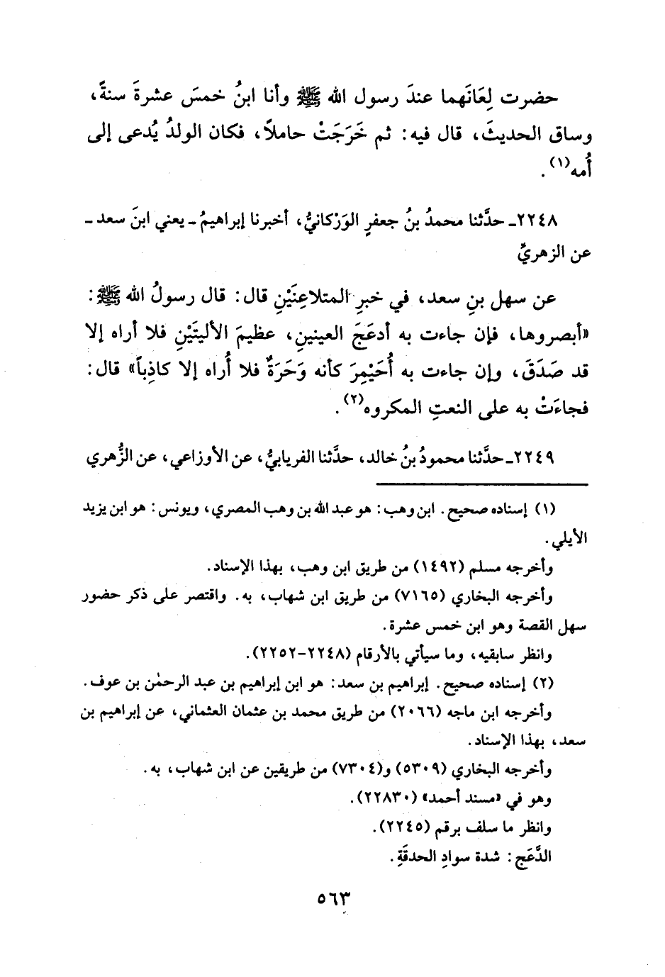 ٢٢٤٨ - حدَّثنا محمدُ بنُ جعفرٍ الوَرْكانيُّ, أخبرنا إبراهيمُ -يعني ابنَ سعد- عن الزهري عن سهل بنِ سعد، في خبر المتلاعِنَيْنِ قال: قال رسولُ الله -صلَّى الله عليه وسلم-: "أبصروها، فإن جاءت به أدعَجَ العينينِ، عظيمَ الأليتَيْنِ فلا أراه إلا قد صَدَقَ، وإن جاءت به أُحَيْمِرَ كأنه وَحَرَةٌ فلا أُراه إلا كاذِباً" قال: فجاءت به على النعتِ المكروه (¬٢).