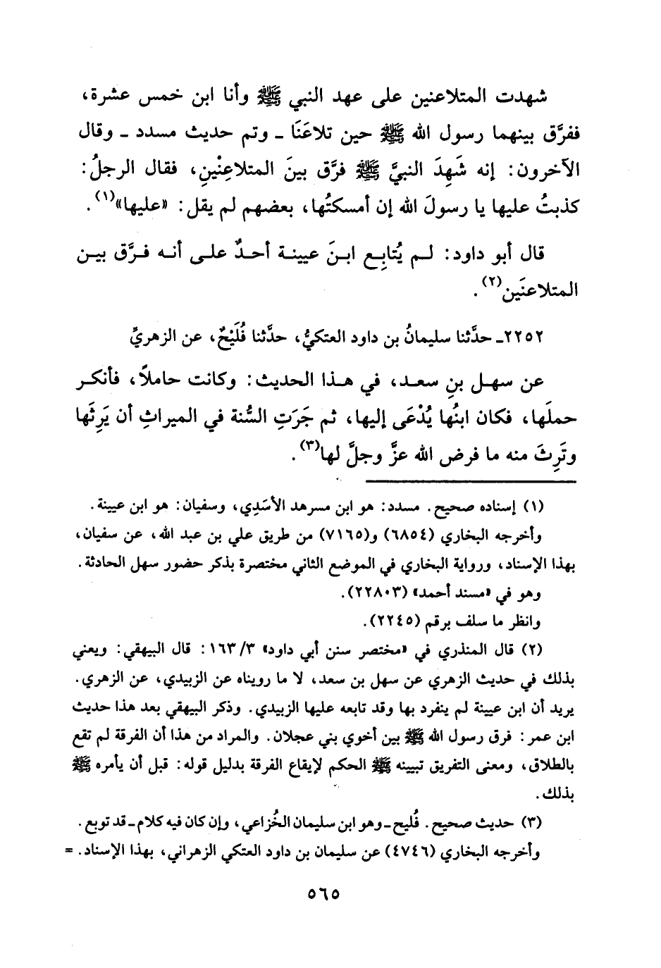٢٢٥٢ - حدَّثنا سليمانُ بن داود العتكعيُّ، حدَّثنا فُلَيحٌ، عن الزهريِّ عن سهل بنِ سعد، في هذا الحديث: وكانت حاملاً، فأنكر حملَها، فكان ابنُها يُدْعَى إليها، ثم جَرَتِ السُّنة في الميراثِ أن يَرِثَها وتَرِثَ منه ما فرض الله عزَّ وجلَّ لها (¬٣).