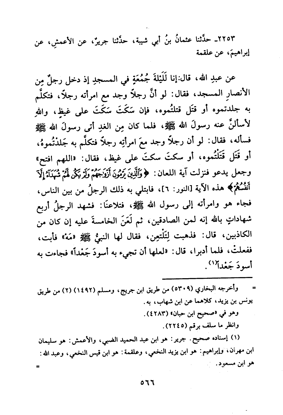 ٢٢٥٣ - حدَّثنا عثمانُ بنُ أبي شيبة، حدَّثنا جريرٌ، عن الأعمشِ، عن إبراهيمَ، عن علقمة عن عبدِ الله، قال: إنا لَلَيلةَ جُمُعَةٍ في المسجدِ إذ دخل رجل مِن الأنصارِ المسجد، فقال: لو أنَّ رجلاً وجد مع امرأته رجلاً، فتكلم به جلدتموه أو قتَل قتلتُموه، فإن سَكَتَ سَكَتَ على غيظٍ، واللهِ لأسألنَّ عنه رسولَ الله -صلَّى الله عليه وسلم-، فلما كان مِن الغدِ أتى رسولَ الله -صلَّى الله عليه وسلم- فسأله، فقال: لو أن رجلاً وجد معَ امرأتِه رجلاً فتكلَّم به جَلدتُموهُ، أو قَتَل قتلْتُموه، أو سكتَ سكتَ على غيظ، فقال: "اللهم افتح" وجعل يدعو فنزلت آية اللعان: {وَالَّذِينَ يَرْمُونَ أَزْوَاجَهُمْ وَلَمْ يَكُنْ لَهُمْ شُهَدَاءُ إِلَّا أَنْفُسُهُمْ} [النور: ٦]، فابتلي به ذلك الرجلُ من بين الناس، فجاء هو وامرأته إلى رسول الله -صلَّى الله عليه وسلم-، فتلاعنَا: فشهد الرجلُ أربع شهاداتٍ بالله إنه لمن الصادقين، ثم لَعَنَ الخامسةَ عليه إن كان من الكاذبين، قال: فذهبت لِتَلْتعِن، فقال لها النبي -صلَّى الله عليه وسلم- "مَه" فأبت، ففعلت، فلما أدبرا، قال: "لعلها أن تجيء به أسودَ جَعْداً" فجاءت به أسودَ جَعداً (¬١).