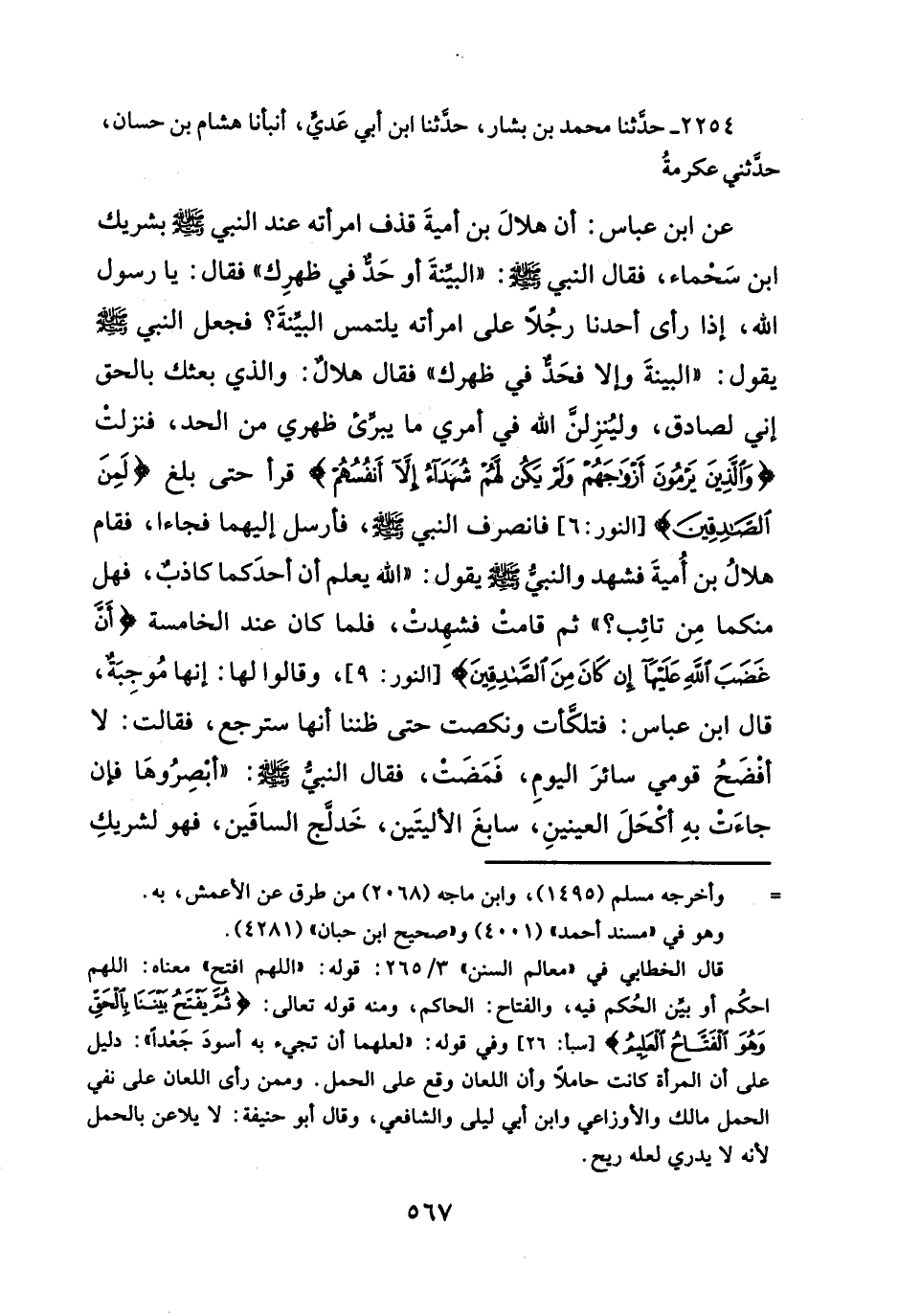 عن ابن عباس: أن هلالَ بن أميةَ قذف امرأته عند النبي -صلَّى الله عليه وسلم- بشريك ابن سَحماء، فقال النبي -صلَّى الله عليه وسلم-: "البينةَ أو حَدٌّ في ظهرِك" فقال: يا رسول الله، إذا رأى أحدنا رجُلاً على امرأته يلتمس البيِّنةَ؟ فجعل النبي -صلَّى الله عليه وسلم- يقول: "البينةَ وإلا فحَدٌّ في ظهرك" فقال هلالٌ: والذي بعثك بالحق إني لصادق، وليُنزِلنَّ الله في أمري ما يبرِّئ ظهري من الحد، فنزلت {وَالَّذِينَ يَرْمُونَ أَزْوَاجَهُمْ وَلَمْ يَكُنْ لَهُمْ شُهَدَاءُ إِلَّا أَنْفُسُهُمْ} قرأ حتى بلغ {لَمِنَ الصَّادِقِينَ} [النور: ٦] فانصرف النبي -صلَّى الله عليه وسلم-، فأرسل إليهما فجاءا، فقام هلالُ بن أُميةَ فشهد والنبيُّ -صلَّى الله عليه وسلم- يقول: "الله يعلم أن أحدَكما كاذبٌ، فهلِ منكما مِن تائِب؟ " ثم قامتْ فشهِدتْ، فلما كان عند الخامسة {أَنَّ غَضَبَ اللَّهِ عَلَيْهَا إِنْ كَانَ مِنَ الصَّادِقِينَ} [النور: ٩] , وقالوا لها: إنها مُوجِبَةٌ، قال ابن عباس: فتلكَّأت ونكصت حتى ظننا أنها سترجع، فقالت: لا أفْضَحُ قومي سائرَ اليومِ، فَمَضَتْ، فقال النبي -صلَّى الله عليه وسلم-: "أبْصِرُوهَا فإن جاءَت بهِ أكحَلَ العينينِ، سابغَ الأليتَين، خَدلَّج الساقَين، فهو لشريكِ