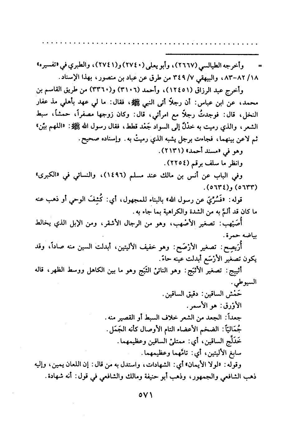 وأخرج عبد الرزاق (١٢٤٥١)، وأحمد (٣١٠٦) و (٣٣٦٠) من طريق القاسم بن محمد، عن ابن عباس: أن رجلاً أتى النبي -صلَّى الله عليه وسلم-، فقال: ما لي عهد بأهلي مذ عفار النخل، قال: فوجدتُ رجلاً مع امرأتي، قال: وكان زوجها مصفراً، حمشاً، سبط الشعر، والذي رميت به خدْلٌ إلى السواد جَعد قطط، فقال رسول الله -صلَّى الله عليه وسلم-: "اللهم بيِّن" ثم لاعن بينهما، فجاءت برجل يشبه الذي رميت به. وإسناده صحيح.