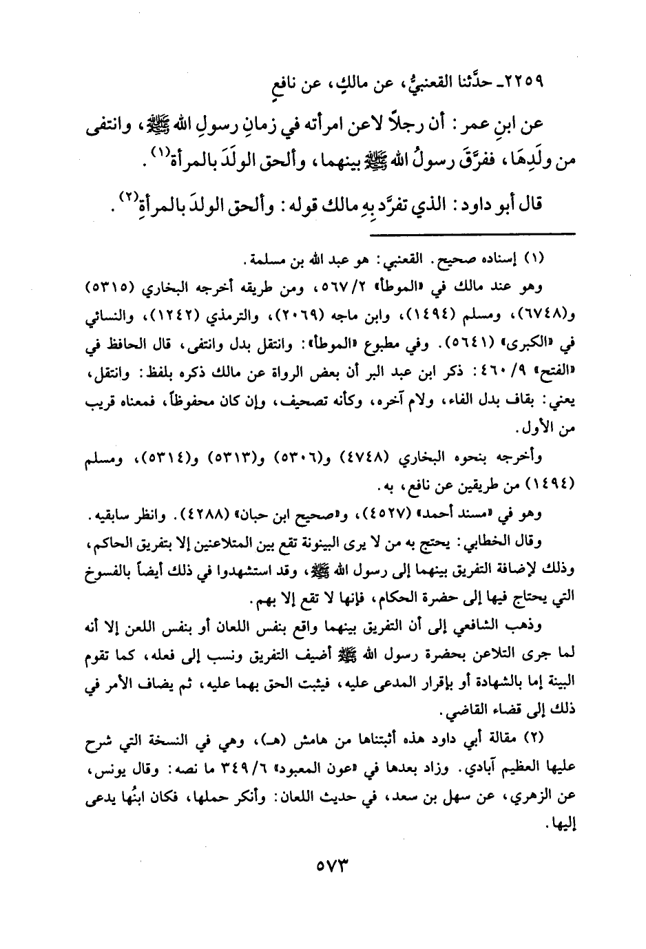 (¬٢) مقالة أبي داود هذه أثبتناها من هامش (هـ)، وهي في النسخة التي شرح عليها العظيم آبادي. وزاد بعدها في "عون المعبود" ٦/ ٣٤٩ ما نصه: وقال يونس، عن الزهري، عن سهل بن سعد، في حديث اللعان: وأنكر حملها، فكان ابنُها يدعى إليها.