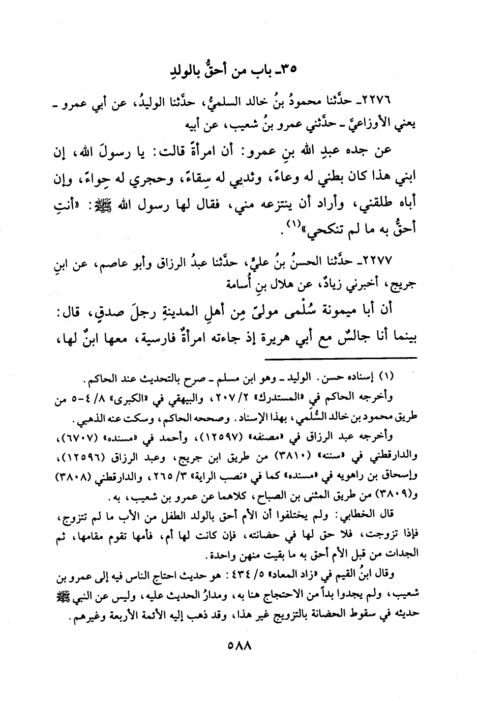 وقال ابنُ القيم في "زاد المعاد" ٥/ ٤٣٤: هو حديث احتاج الناس فيه إلى عمرو بن شعيب، ولم يجدوا بداً من الاحتجاج هنا به، ومدارُ الحديث عليه، وليس عن النبي -صلَّى الله عليه وسلم- حديثه في سقوط الحضانة بالتزويج غير هذا، وقد ذهب إليه الأئمة الأربعة وغيرهم.