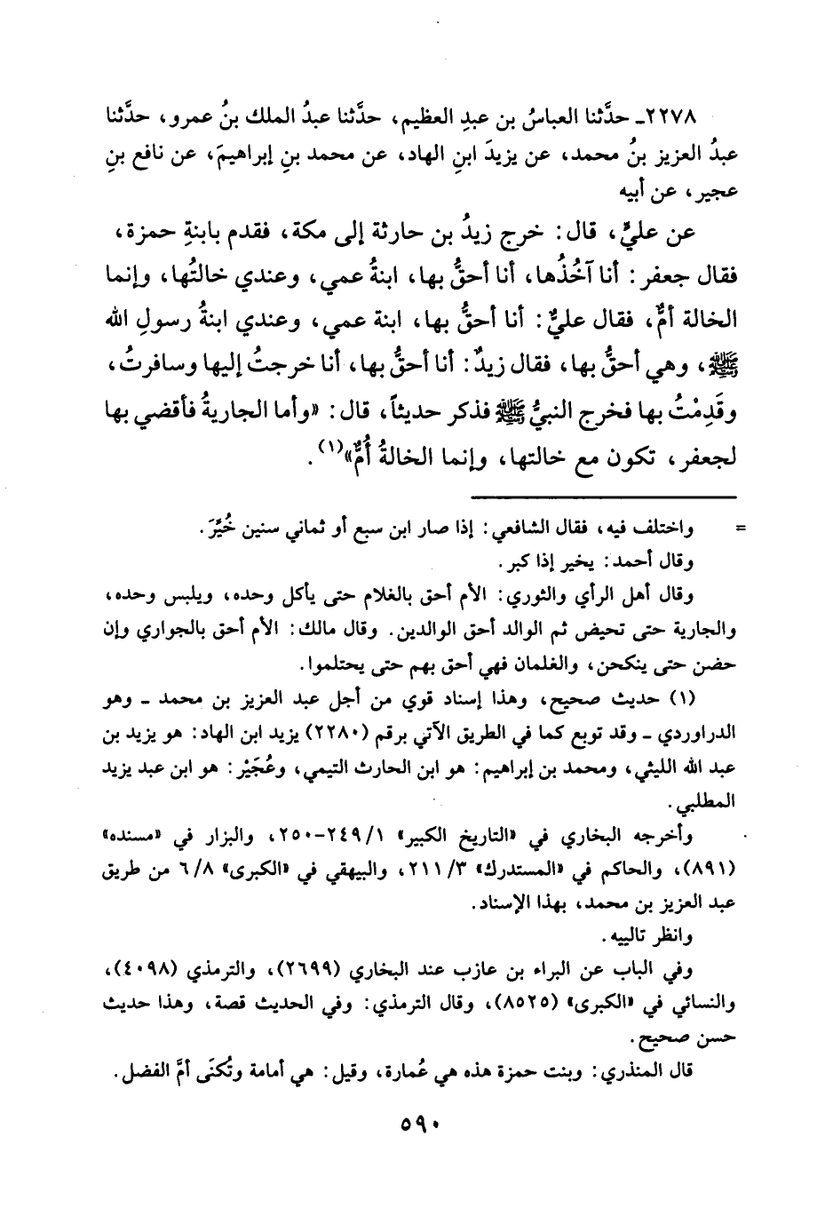 ٢٢٧٨ - حدَّثنا العباسُ بن عبدِ العظيم، حدَّثنا عبدُ الملك بنُ عمرو، حدَّثنا عبدُ العزيز بنُ محمد، عن يزيدَ ابنِ الهاد، عن محمد بنِ إبراهيمَ، عن نافع بنِ عجير، عن أبيه عن علي، قال: خرج زيدُ بن حارثة إلى مكة، فقدم بابنةِ حمزة، فقال جعفر: أنا آخُذُها، أنا أحق بها، ابنةُ عمي، وعندي خالتُها، وإنما الخالة أم، فقال عليٌّ: أنا أحق بها، ابنة عمي، وعندي ابنةُ رسولِ الله - صلى الله عليه وسلم -، وهي أحقُّ بها، فقال زيدٌ: أنا أحقُّ بها، أنا خرجتُ إليها وسافرتُ، وقَدِمْتُ بها فخرج النبي -صلَّى الله عليه وسلم- فذكر حديثاً، قال: "وأما الجاريهُ فأقضي بها لجعفر، تكون مع خالتها، وإنما الخالةُ أُم" (¬١).