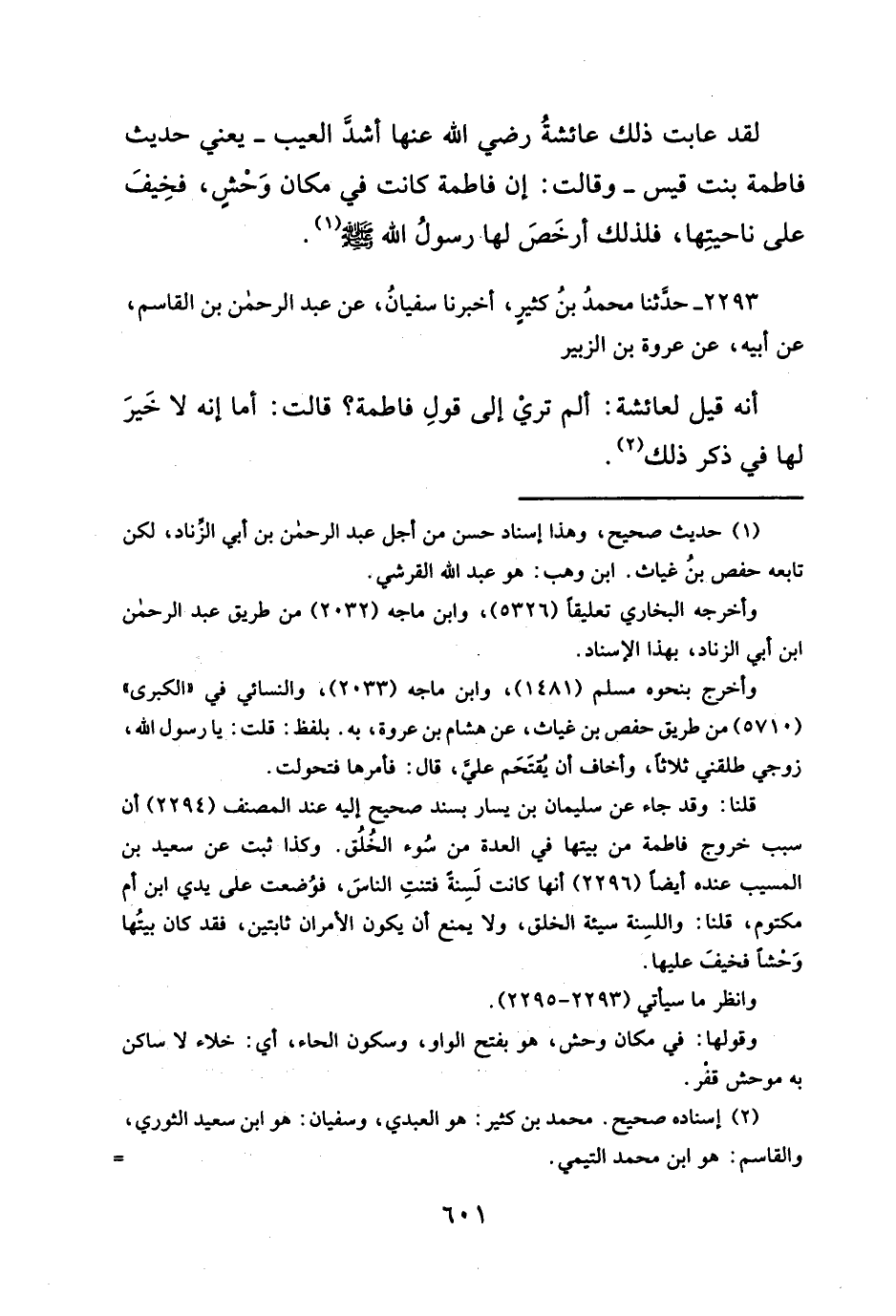 قلنا: وقد جاء عن سليمان بن يسار بسند صحيح إليه عند المصنف (٢٢٩٤) أن سبب خروج فاطمة من بيتها في العدة من سوء الخُلُق. وكذا ثبت عن سعيد بن المسيب عنده أيضاً (٢٢٩٦) أنها كانت لَسِنةً فتنتِ الناسَ، فوُضعت على يدي ابن أم مكتوم، قلنا: واللسِنة سيئة الخلق، ولا يمنع أن يكون الأمران ثابتين، فقد كان بيتُها وَحشاً فخيفَ عليها.