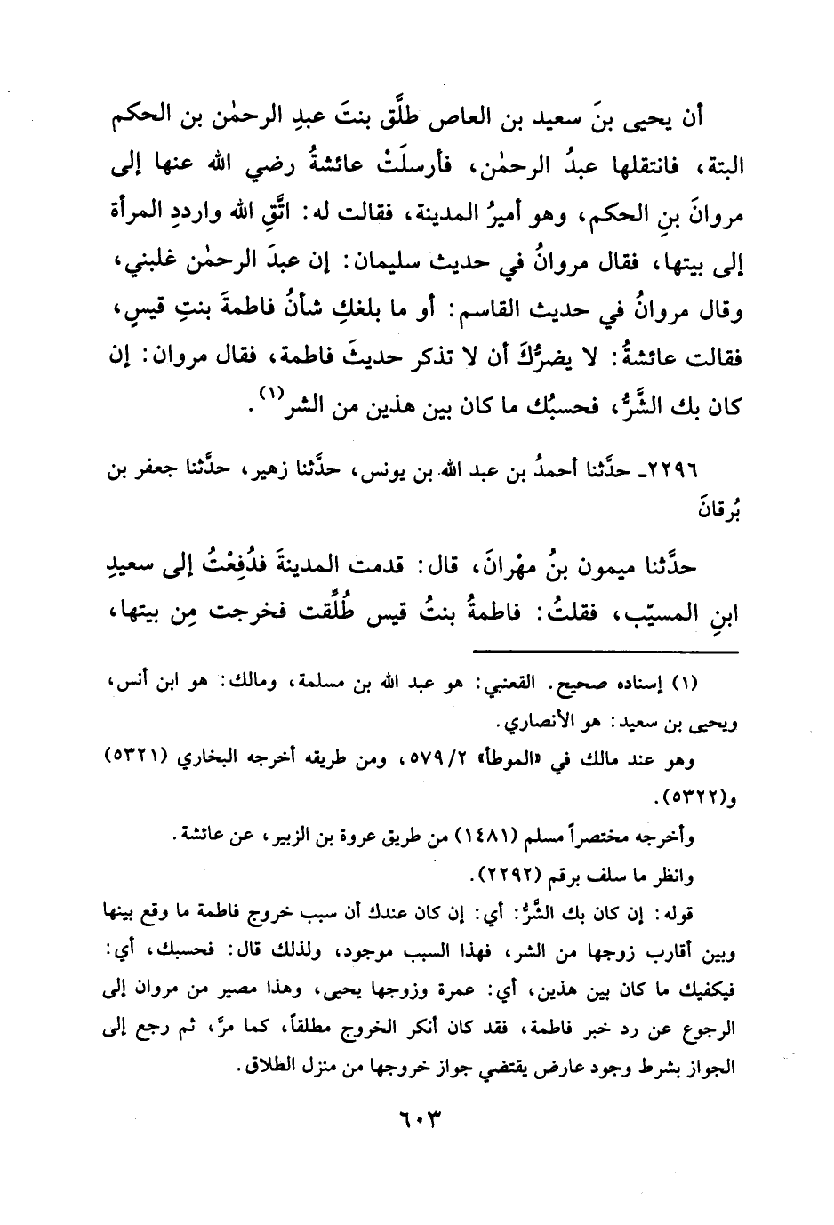 أن يحيى بنَ سعيد بن العاص طلَّق بنتَ عبدِ الرحمن بن الحكم البتة، فانتقلها عبدُ الرحمن، فأرسلَتْ عائشةُ رضي الله عنها إلى مروانَ بنِ الحكم، وهو أميرُ المدينة، فقالت له: اتقِ الله وارددِ المرأة إلى بيتها، فقال مروانُ في حديث سليمان: إن عبدَ الرحمن غلبني، وقال مروانُ في حديث القاسم: أو ما بلغكِ شأنُ فاطمةَ بنتِ قيسٍ، فقالت عائشةُ: لا يضرُّكَ أن لا تذكر حديثَ فاطمة، فقال مروان: إن كان بك الشَّرُّ، فحسبُك ما كان بين هذين من الشر (¬١).