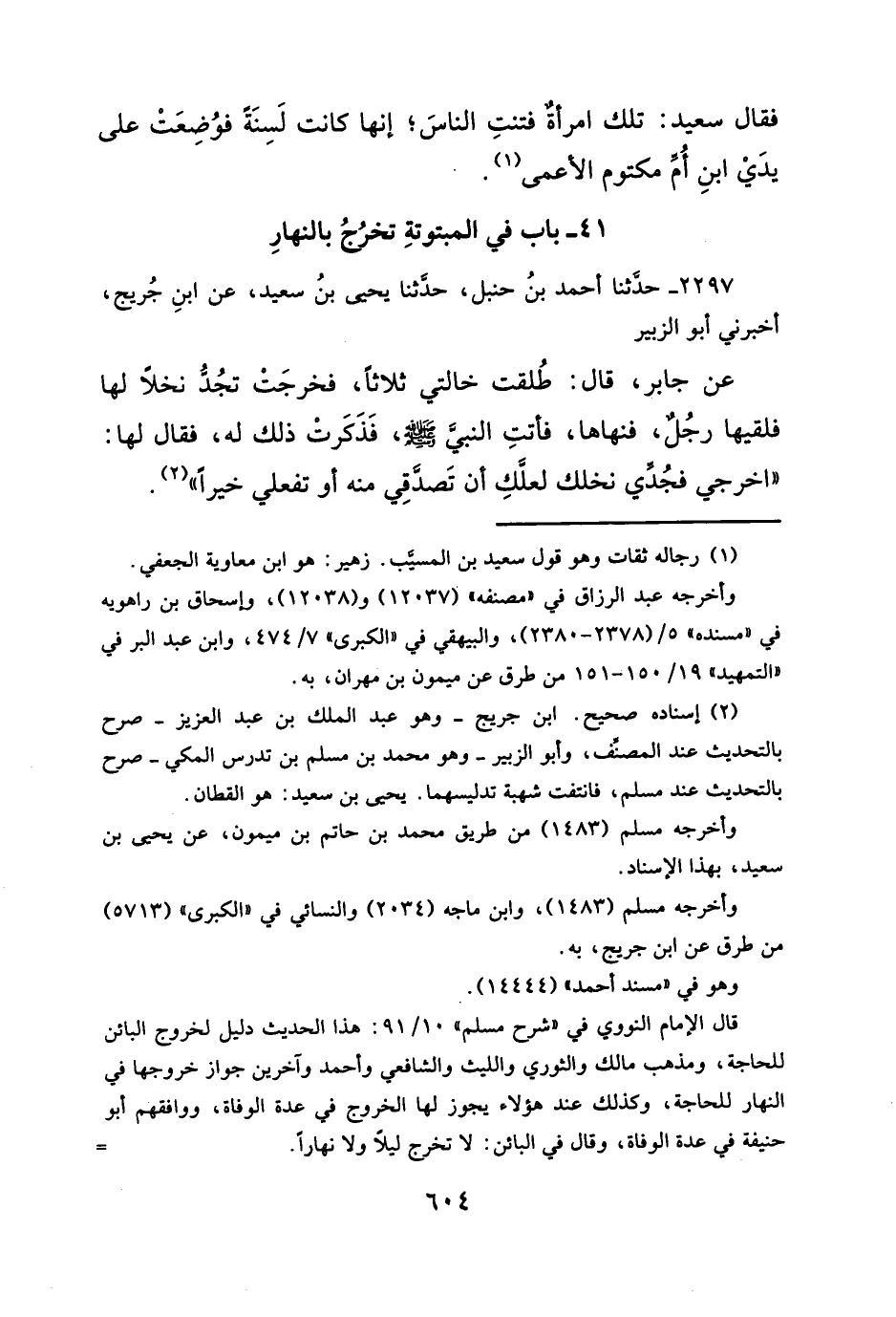 ٢٢٩٧ - حدَّثنا أحمد بنُ حنبل، حدَّثنا يحيى بنُ سعيد، عن ابنِ جُريج، أخبرني أبو الزبير عن جابر، قال: طُلقت خالتي ثلاثاً، فخرجَت تجُدُ نخلاً لها فلقيها رجُلٌ، فنهاها، فأتتِ النبيَّ -صلَّى الله عليه وسلم-، فَذَكَرتْ ذلك له، فقال لها: "اخرجي فجُدِّي نخلك لعلَّكِ أن تَصدَّقِي منه أو تفعلي خيراً" (¬٢).