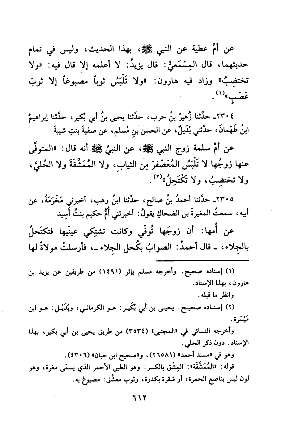٢٣٠٥ - حدَّثنا أحمدُ بنُ صالح، حدَّثنا ابنُ وهب، أخبرنى مَخرَمَةُ، عن أبيه، سمعتُ المغيرةَ بن الضحاكِ يقولُ: أخبرتني أُمُّ حكيم بنتُ أَسِيد عن أُمها: أن زوجَها تُوفي وكانت تشتِكي عينَيها فتكتَحلُ بالجِلاء، -قال أحمدُ: الصوابُ بكُحل الجِلاء-، فأرسلت مولاةً لها