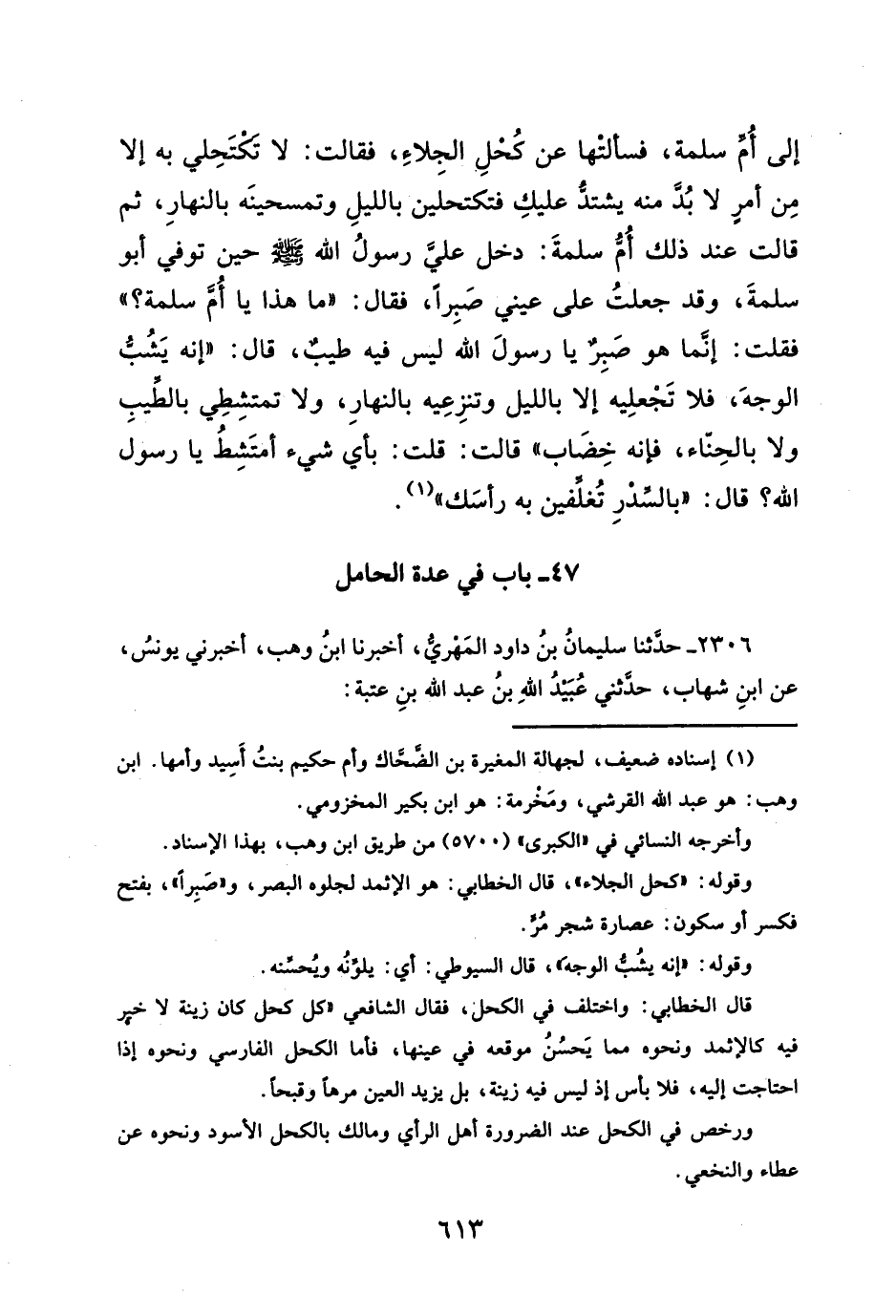 إلى أُمِّ سلمة، فسألتْها عن كُحْلِ الجِلاء فقالت: لا تَكتحِلي به إلا مِن أمرٍ لا بُدَّ منه يشتدُّ عليكِ فتكتحلين بالليلِ وتمسحينَه بالنهارِ، ثم قالت عند ذلك أُمُّ سلمةَ: دخل عليَّ رسولُ الله -صلَّى الله عليه وسلم- حين توفي أبو سلمةَ، وقد جعلتُ على عيني صَبِراً، فقال: "ما هذا يا أُمَّ سلمة؟ " فقلت: إنَّما هو صَبِرٌ يا رسولَ الله ليس فيه طيبٌ، قال: "إنه يَشُبُّ الوجهَ، فلا تَجْعلِيه إلا بالليل وتنزِعِيه بالنهارِ، ولا تمتشِطِي بالطِّيبِ ولا بالحِنّاء، فإنه خِضَاب" قالت: قلت: بأي شيء أمتَشِطُ يا رسول الله؟ قال: "بالسِّدْرِ تُغلِّفين به رأسَك" (¬١).