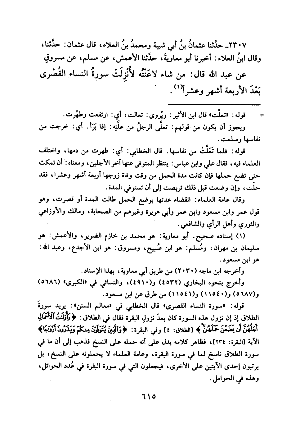 ٢٣٠٧ - حدَّثنا عثمانُ بنُ أبي شيبة ومحمدُ بنُ العلاء، قال عثمان: حدَّثنا، وقال ابنُ العلاء: أخبرنا أبو معاويةَ، حدَّثنا الأعمش، عن مسلم، عن مسروقٍ عن عبد الله قال: من شاء لاعَنتُه لأُنزِلَتْ سورةُ النساء القُصرى بَعْدَ الأربعة أشهر وعشراً (¬١).