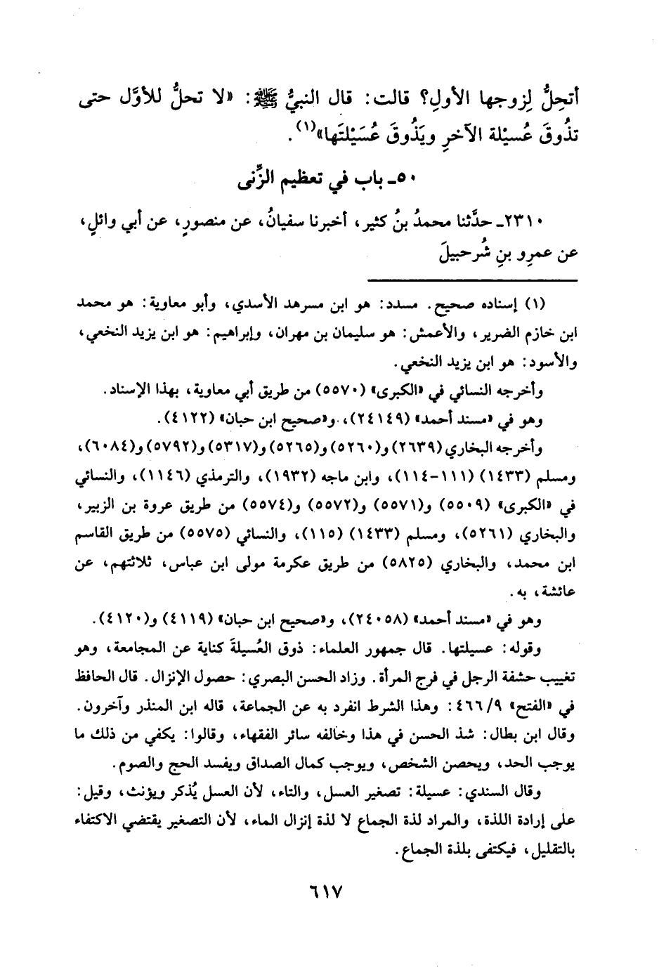 ٢٣١٠ - حدَّثنا محمدُ بنُ كثير، أخبرنا سفيانُ، عن منصورٍ، عن أبي وائلٍ، عن عمرِو بنِ شُرحبيلَ