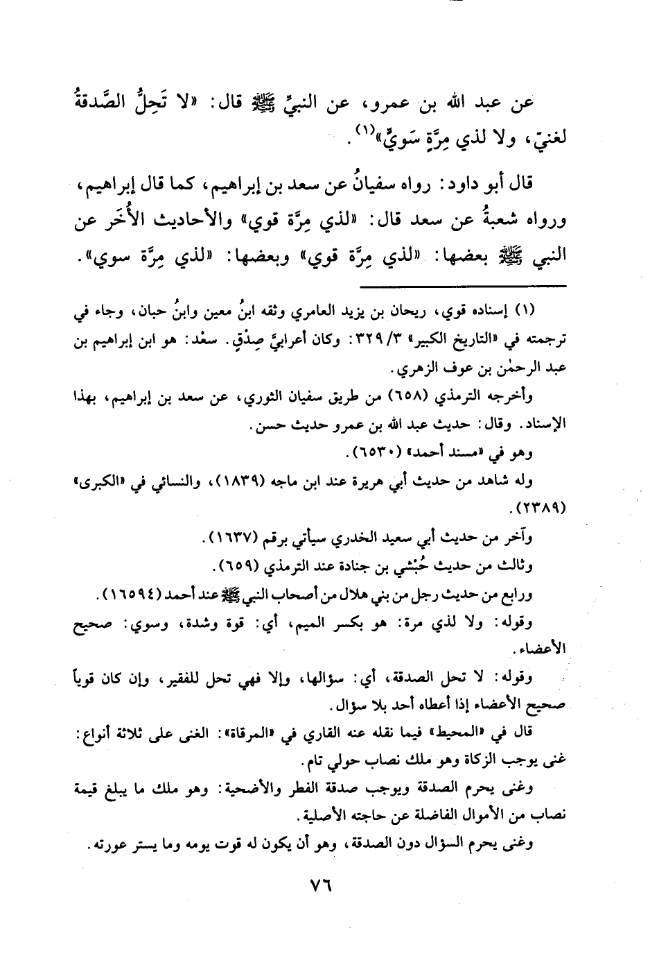 عن عبد الله بن عمرو، عن النبيَّ - صلَّى الله عليه وسلم - قال: "لا تَحِل الصَّدقةُ لغنيّ، ولا لذي مِرَّةِ سَويٍّ" (¬١).