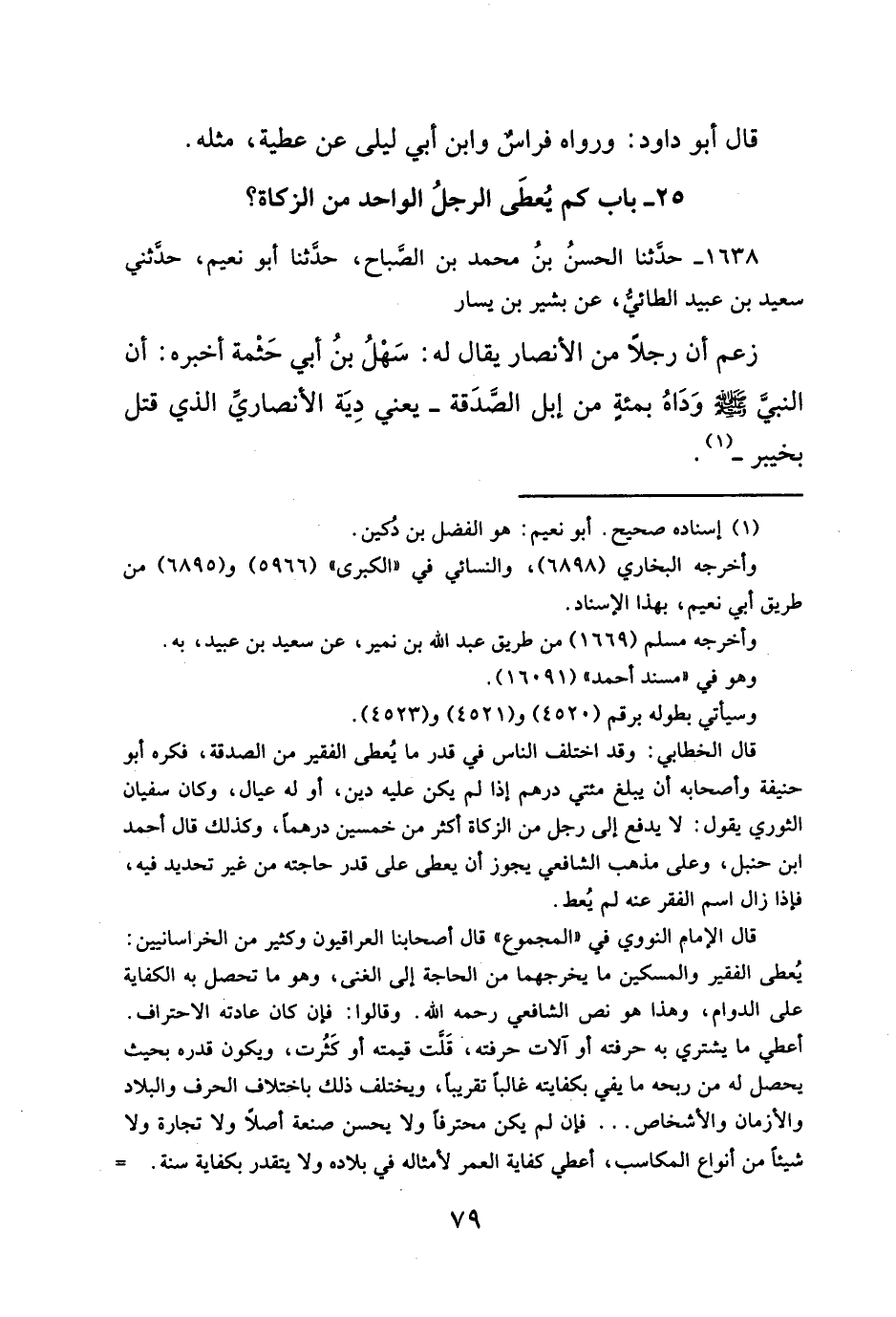 قال الخطابي: وقد اختلف الناس في قدر ما يُعطى الفقير من الصدقة، فكره أبو حنيفة وأصحابه أن يبلغ مئتي درهم إذا لم يكن عليه دين، أو له عيال، وكان سفيان الثوري يقول: لا يدفع إلى رجل من الزكاة أكثر من خمسين درهماً، وكذلك قال أحمد ابن حنبل، وعلى مذهب الشافعي يجوز أن يعطى على قدر حاجته من غير تحديد فيه، فإذا زال اسم الفقر عنه لم يُعط.