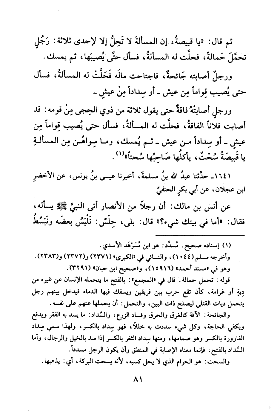 ثم قال: "يا قبيصةُ، إن المسألةَ لا تَحِلُّ إلا لإحدى ثلاثة: رَجُلٍ تحمَّلَ حَمالةً، فحلَّت له المسألةُ، فسأل حتَى يُصيبَها، ثم يمسك.