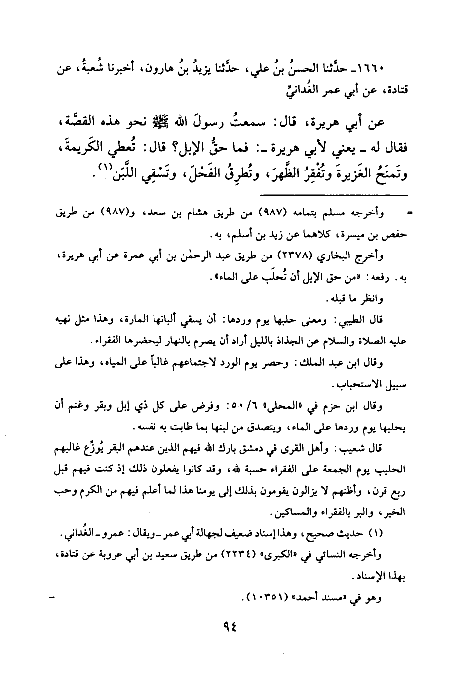 قال شعيب: وأهل القرى في دمشق بارك الله فيهم الذين عندهم البقر يُوزِّع غالبهم الحليب يوم الجمعة على الفقراء حسبة لله، وقد كانوا يفعلون ذلك إذ كنت فيهم قبل ربع قرن، وأظنهم لا يزالون يقومون بذلك إلى يومنا هذا لما أعلم فيهم من الكرم وحب الخير، والبر بالفقراء والمساكين.