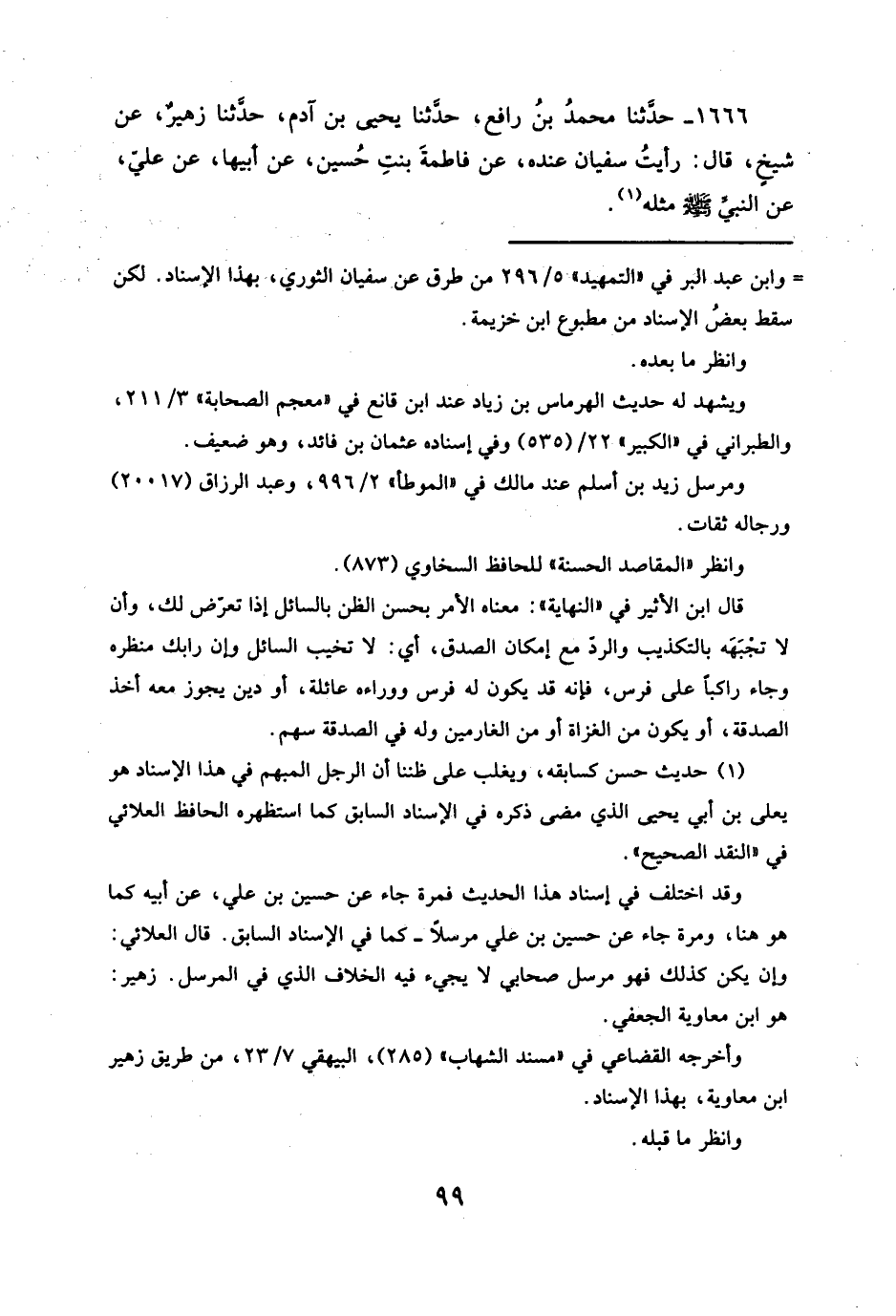 ١٦٦٦ - حدَّثنا محمدُ بنُ رافع، حدَّثنا يحيى بن آدم، حدَّثنا زهيرٌ، عن شيخٍ، قال: رأيتُ سفيان عنده، عن فاطمةَ بنتِ حُسين، عن أبيها، عن عليّ، عن النبيِّ - صلَّى الله عليه وسلم - مثله (¬١).