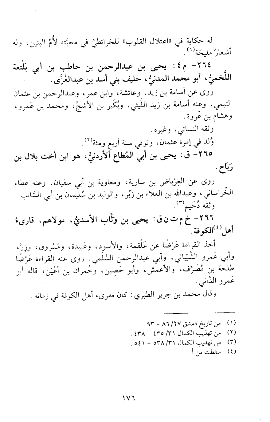 266 - خ م ت ن ق: يحيى بن وَثَّاب الأسديُّ مولاهم [الوفاة: 101 - 110 ه]