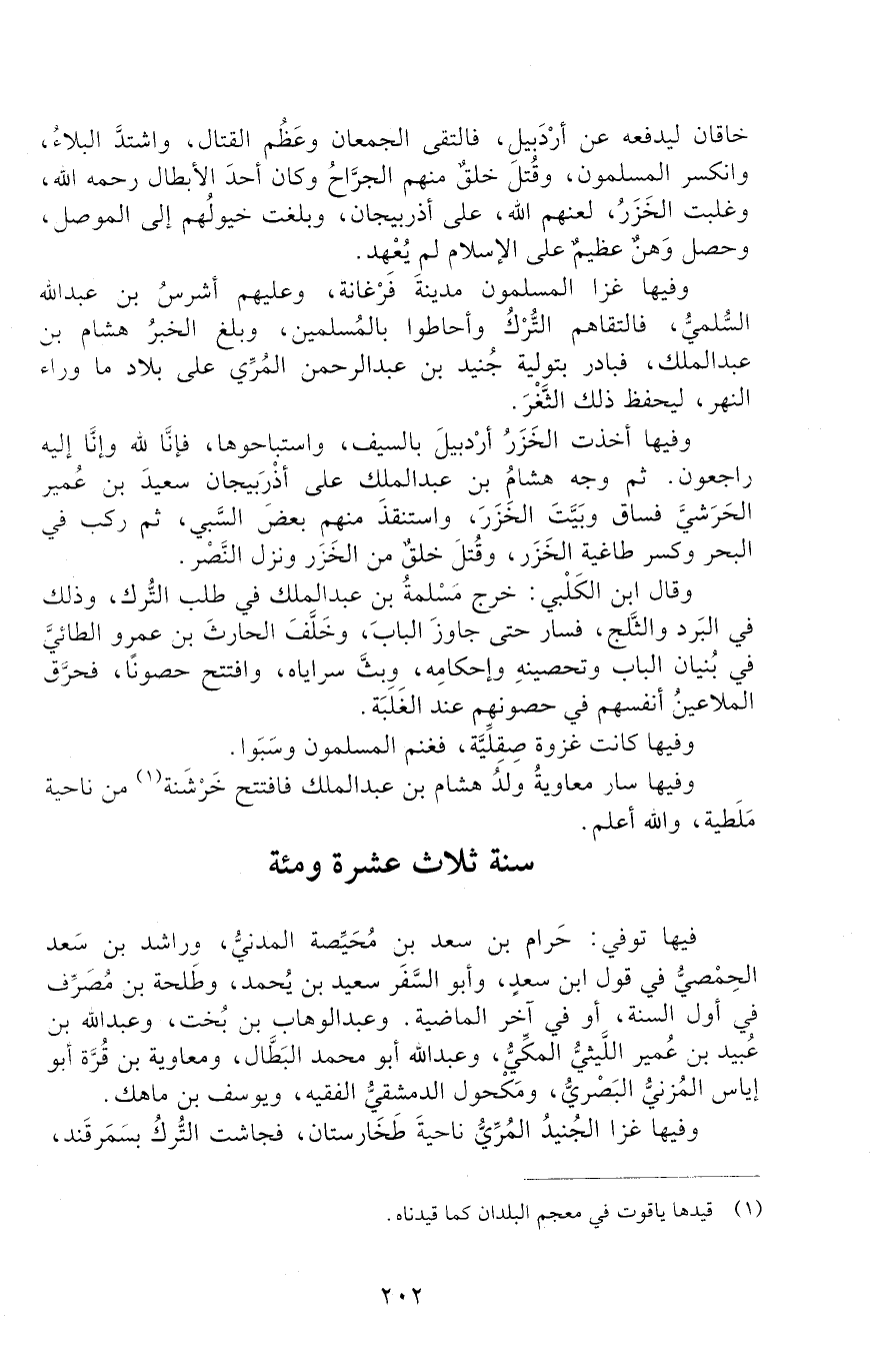 وَفِيهَا غَزَا الْجُنَيْدُ الْمُرِّيُّ نَاحِيَةَ طَخَارَسْتَانَ، فَجَاشَتِ التُّرْكُ بِسَمَرْقَنْدَ، -[203]- فَالْتَقَاهُمُ الْجُنَيْدُ بِقُرْبِ سَمَرْقَنْدَ، فَاقْتَتَلُوا أَشَدَّ قِتَالٍ، ثُمَّ تَحَاجَزُوا، فَكَتَبَ الجنيد إِلَى سَوْرَةَ بْنِ أبجر الدَّارَمِيِّ نَائِبِهِ عَلَى سَمَرْقَنْدَ بِالإِسْرَاعِ إِلَيْهِ، فَخَرَجَ فَلَقِيَهُ التُّرْكُ عَلَى غرّةٍ، فَقَتَلَتْهُ فِي طَائِفَةٍ مِنْ جُنْدِهِ، ثُمَّ إِنَّ الْجُنَيْدَ الْتَقَاهُمْ ثَانِيَةً فَهَزَمَهُمْ وَدَخَلَ سَمَرْقَنْدَ.