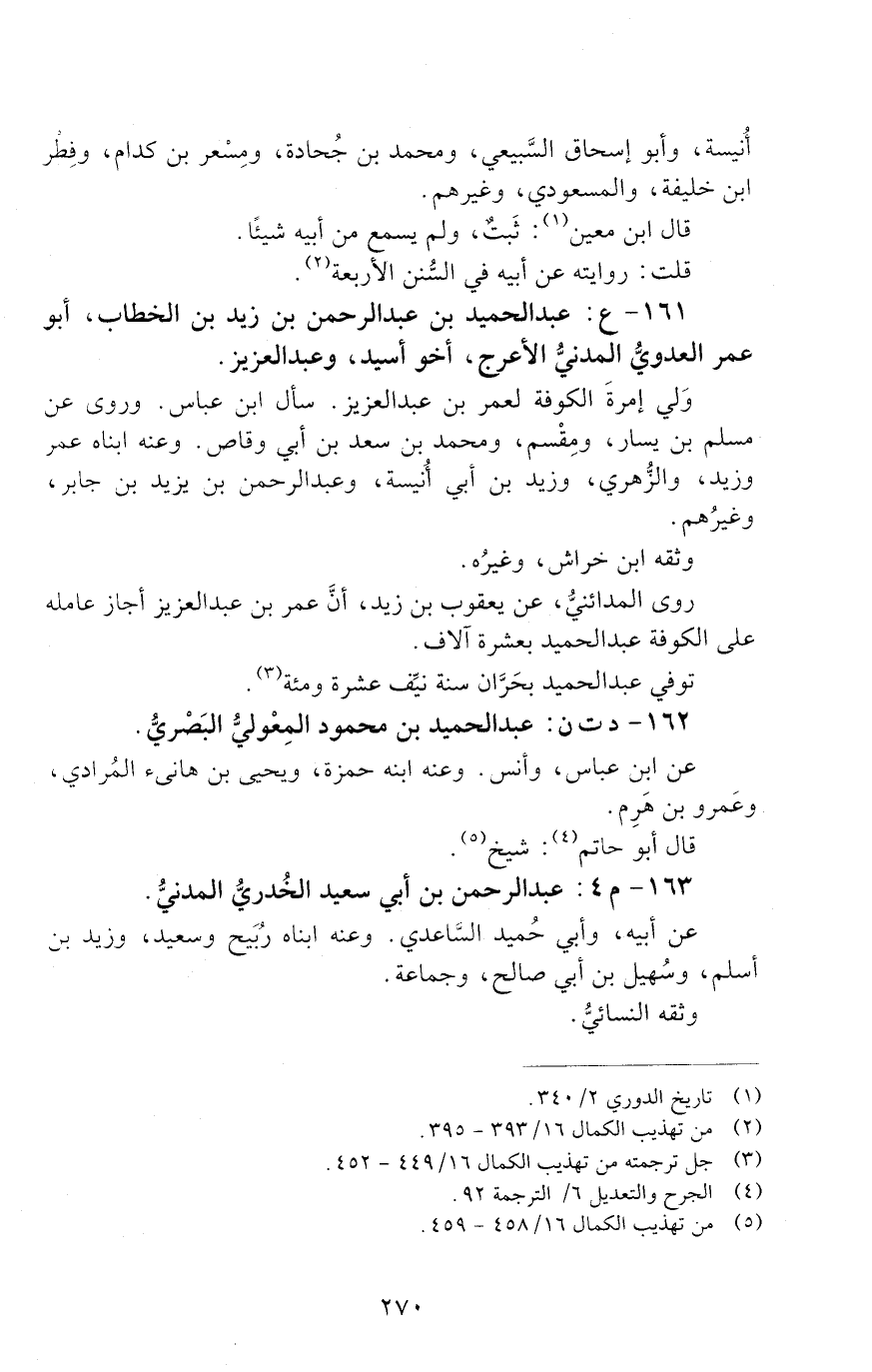 161 - ع: عَبْد الْحَمِيدِ بْن عَبْد الرَّحْمَن بْن زَيْدِ بْن الْخَطَّاب، أَبُو عُمَر العدوي الْمَدَنِيّ الأعرج، [الوفاة: 111 - 120 ه]