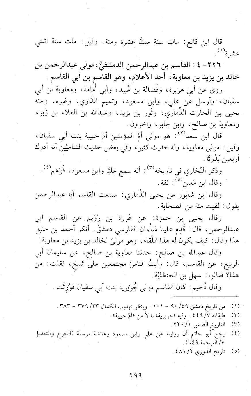 226 - 4: القاسم أَبُو عَبْد الرَّحْمَن الدمشقي، مولى عَبْد الرَّحْمَن بْن خَالِد بْن يزيد بْن معاوية، أحد الأعلام؛ وهو القاسم بْن أَبِي القاسم [الوفاة: 111 - 120 ه]