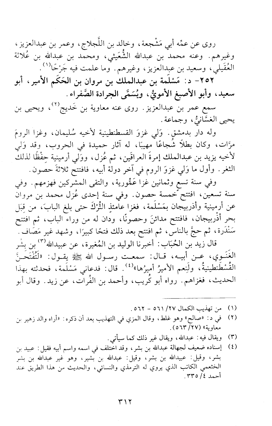 252 - د: مَسْلَمةُ بْنِ عَبْدِ الْمَلِكِ بْنِ مَرْوَانَ بْنِ الْحَكَمِ الأمير، أَبُو سَعِيد، وأَبُو الأصبغ الأمويُّ، وَيُسَمَّى الجرادة الصَّفراء [الوفاة: 111 - 120 ه]