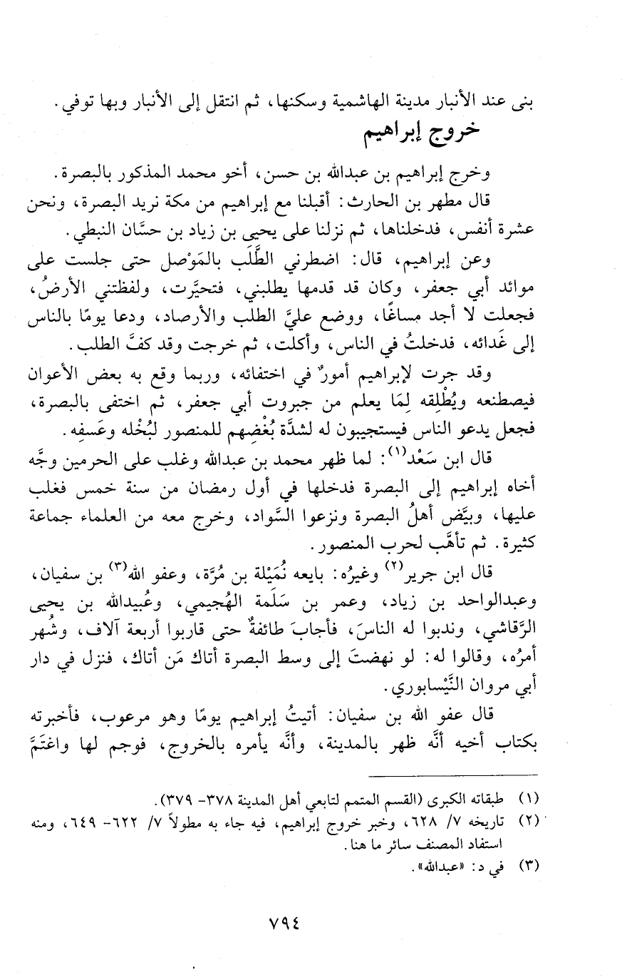 قَالَ عَفُوُّ اللَّهِ بْنُ سُفْيَانَ: أَتَيْتُ إِبْرَاهِيمَ يَوْمًا وَهُوَ مَرْعُوبٌ، فَأَخْبَرْتُهُ بِكِتَابِ أَخِيهِ أَنَّهُ ظَهَرَ بِالْمَدِينَةِ، وَأَنَّهُ يَأْمُرُهُ بِالْخُرُوجِ، فَوَجَمَ لَهَا واغتم، -[795]- فَأَخَذْتُ أُسَهِّلُ عَلَيْهِ وَأَقُولُ: قَدِ اجْتَمَعَ لَكَ أَمْرُكَ، مَعَكَ مَضَّاءُ التَّغْلِبِيُّ وَالطُّهَوِيُّ وَالْمُغِيرَةُ، وَأَنَا، وَجَمَاعَةٌ، فَنَخْرُجُ إِلَى السِّجْنِ فِي اللَّيْلِ فَنَفْتَحُهُ، وَيُصْبِحُ مَعَكَ خَلْقٌ مِنَ النَّاسِ، فَطَابَتْ نَفْسُهُ، وَبَلَغَ ذَلِكَ الْمَنْصُورَ فَجَهَّزَ جَيْشًا إِلَى الْبَصْرَةِ، ثُمَّ سَارَ فَنَزَلَ الْكُوفَةَ لِيَكْتَفِي شَرَّ الشِّيعَةِ وَفَتْقَهُمْ.