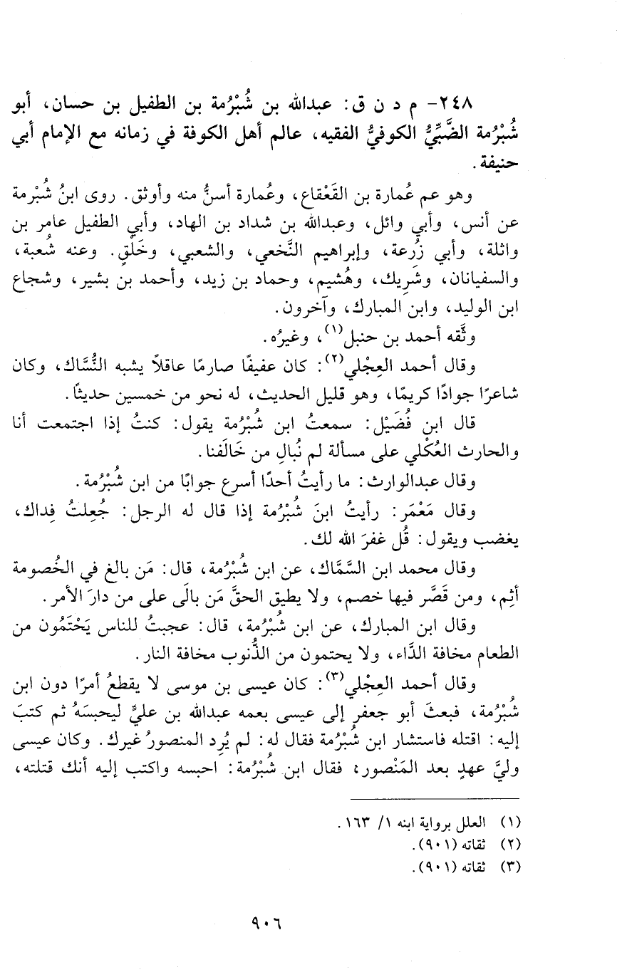 248 - م د ن ق: عَبْدُ اللَّهِ بْنُ شُبْرُمَةَ بْنُ الطُّفَيْلِ بْنُ حَسَّانٍ، أَبُو شُبْرُمَةَ الضَّبِّيُّ الْكُوفِيُّ الْفَقِيهُ، [الوفاة: 141 - 150 ه]