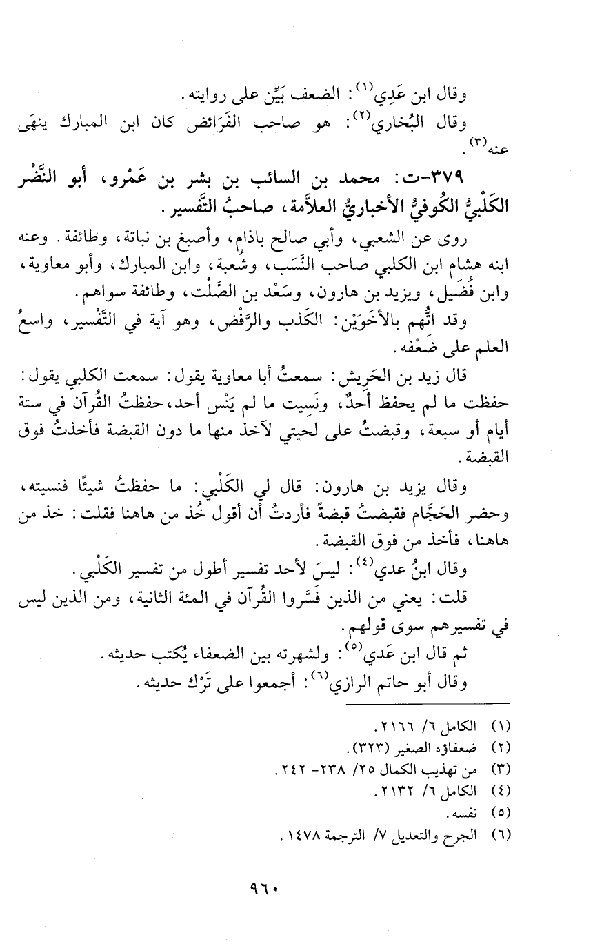 379 - ت: محمد بن السائب بْنُ بِشْرِ بْنِ عَمْرٍو، أَبُو النَّضْرِ الْكَلْبِيُّ الْكُوفِيُّ الأَخْبَارِيُّ الْعَلامَةُ، [الوفاة: 141 - 150 ه]