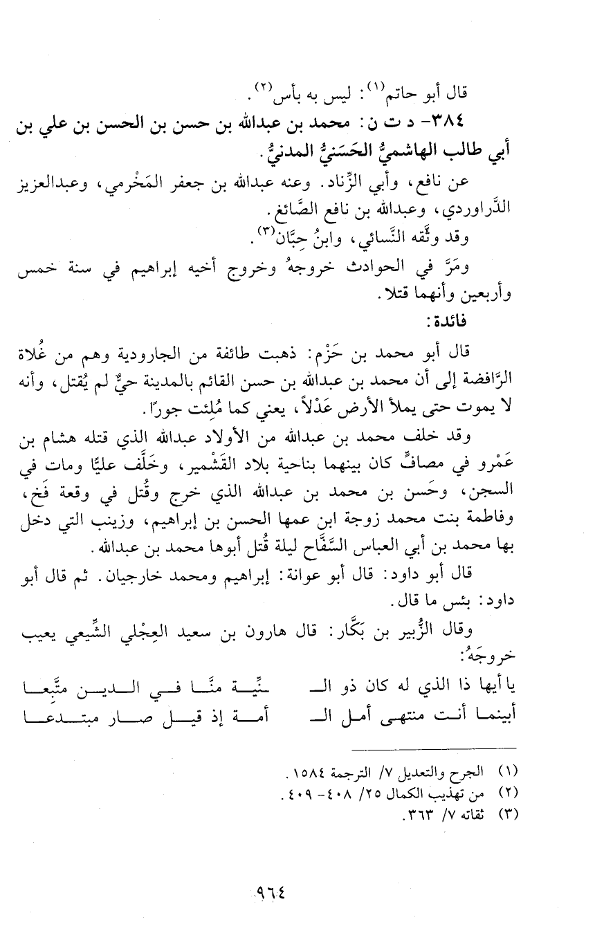 384 - د ت ن: مُحَمَّدُ بْنُ عَبْدِ اللَّهِ بْنِ حَسَنِ بْنِ الْحَسَنِ بْنِ عَلِيّ بْن أبي طَالِب. الْهَاشِمِيُّ الْحَسَنِيُّ الْمَدَنِيُّ. [الوفاة: 141 - 150 ه]