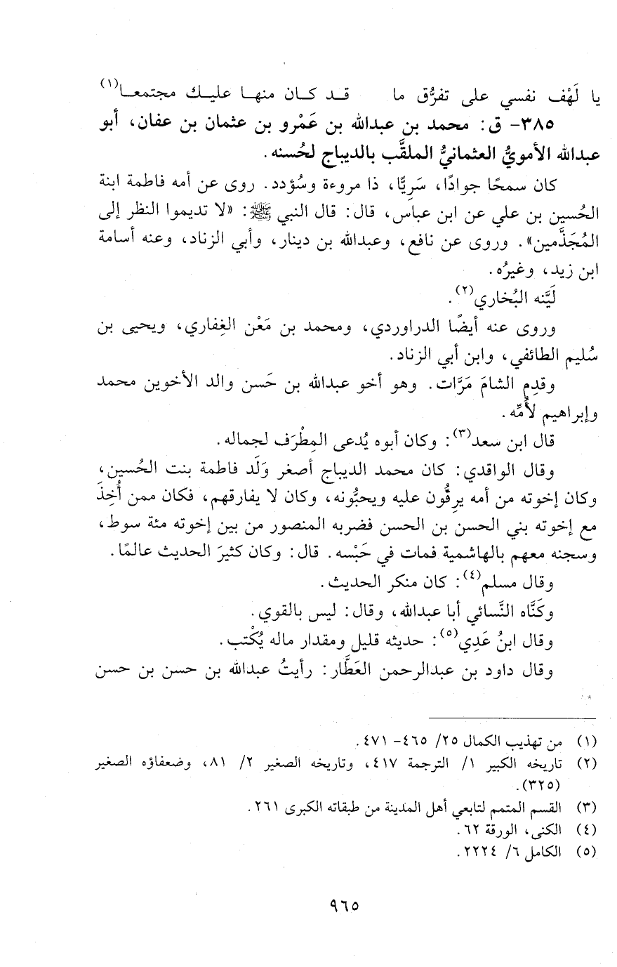 385 - ق: مُحَمَّد بْن عَبْد اللَّهِ بْن عَمْرو بْن عُثْمَانَ بْنِ عَفَّانَ. أَبُو عَبْدِ اللَّهِ الأُمَوِيُّ الْعُثْمَانِيُّ الملقب بالدِّيبَاجُ لِحُسْنِهِ [الوفاة: 141 - 150 ه]