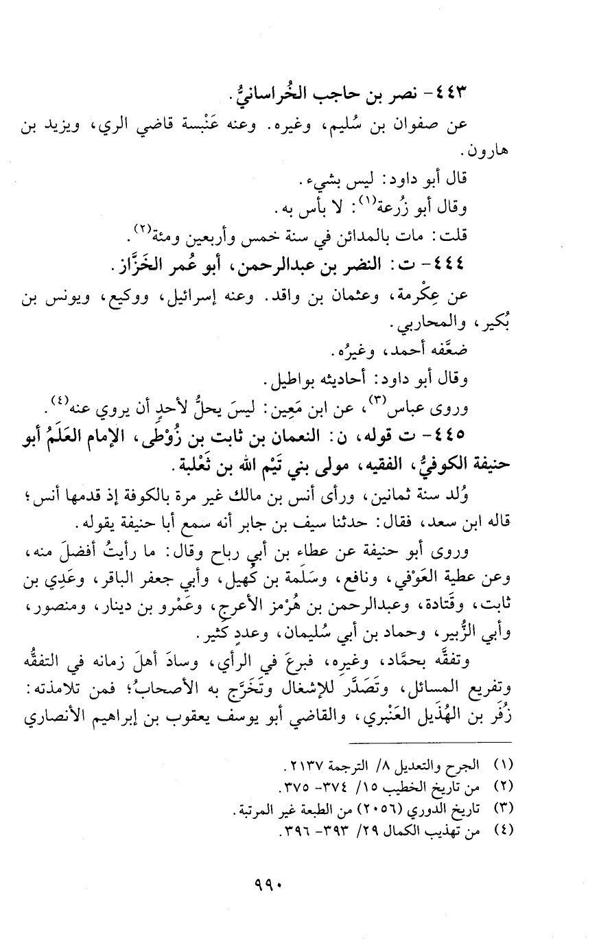 445 - ت قوله، ن: النُّعْمَانُ بْنُ ثَابِتٍ بْنُ زَوْطِيٍّ، الإِمَامُ الْعَلَمُ، أَبُو حَنِيفَةَ الْكُوفِيُّ، الْفَقِيهُ، [الوفاة: 141 - 150 ه]