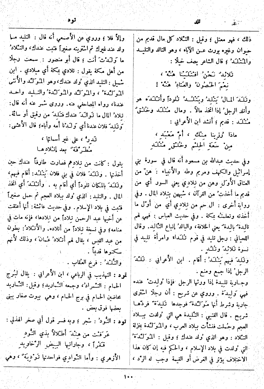 قَالَ الْقُتَيْبِيُّ: التَّليدة هِيَ الَّتِي وُلدت بِبِلَادِ الْعَجَمِ وحُملت فنشأَت بِبِلَادِ الْعَرَبِ، والمُوَلَّدة بِمَنْزِلَةِ التِّلاد: وَهُوَ الَّذِي وُلد عِنْدَكَ؛ وَقِيلَ: المُوَلَّدَةُ الَّتِي وُلدت فِي بِلَادِ الإِسلام، وَالْحُكْمُ فِيهِ إِن كَانَ هَذَا الِاخْتِلَافُ يُؤَثِّرُ فِي الْغَرَضِ أَو الْقِيمَةِ وَجَبَ لَهُ الرَّد، وإِلَّا فلا؛ وَرُوِيَ عَنِ الأَصمعي أَنه قَالَ: التَّلِيدُ مَا وُلِدَ عِنْدَ غَيْرِكَ ثُمَّ اشْتَرَيْتَهُ صَغِيرًا فَثَبَتَ عِنْدَكَ، والتِّلادُ مَا وَلَدْتَ أَنت؛ قَالَ أَبو مَنْصُورٍ: سَمِعْتُ رَجُلًا مِنْ أَهل مَكَّةَ يَقُولُ: تِلَادِي بِمَكَّةَ أَي مِيلَادِي. ابْنُ شُمَيْلٍ: التَّلِيدُ الَّذِي وُلد عِنْدَكَ، وَهُوَ المُوَلَّد والأُنثى المُوَلَّدةُ، والمُوَلَّد والمُوَلَّدةُ وَالتَّلِيدُ وَاحِدٌ عِنْدَنَا، رَوَاهُ الْمَصَاحِفِيُّ عَنْهُ. وَرَوَى شَمِرٌ عَنْهُ أَنه قَالَ: تِلادُ الْمَالِ مَا تَوالَدَ عِنْدَكَ فتَلِدَ مِنْ رَقِيقٍ أَو سَائِمَةٍ. وَتَلِدَ فُلَانٌ عِنْدَنَا أَي وَلَدْنا أُمه وأَباه؛ قَالَ الأَعشى: