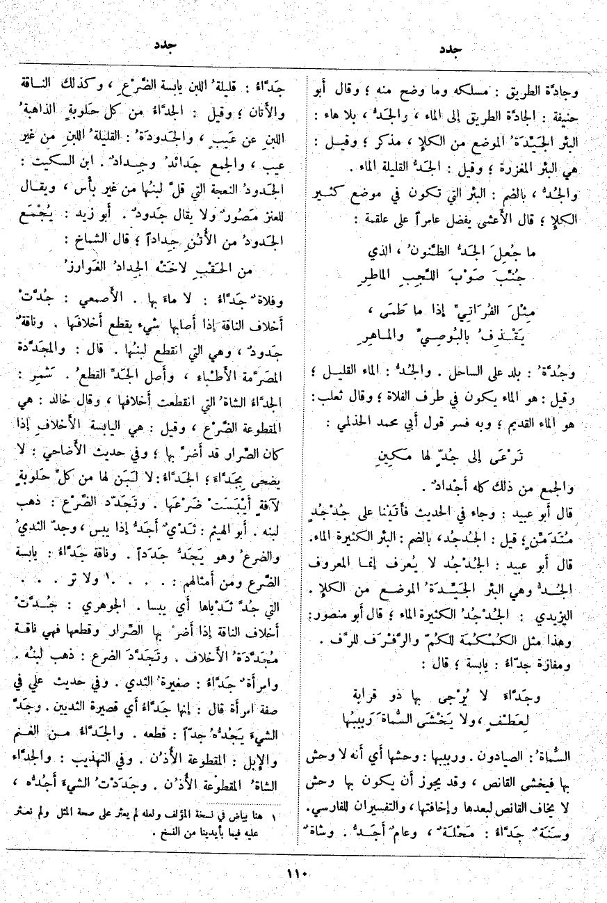 وجادَّة الطَّرِيقِ: مَسْلَكُهُ وَمَا وَضَحَ مِنْهُ؛ وَقَالَ أَبو حَنِيفَةَ: الجادَّة الطَّرِيقُ إِلى الْمَاءِ، والجَدُّ، بِلَا هَاءِ: الْبِئْرُ الجَيِّدَةُ الْمَوْضِعِ مِنَ الكلإِ، مُذَكَّرٌ؛ وَقِيلَ: هِيَ الْبِئْرُ الْمُغْزِرَةُ؛ وَقِيلَ: الجَدُّ الْقَلِيلَةُ الْمَاءِ. والجُدُّ، بِالضَّمِّ: الْبِئْرُ الَّتِي تَكُونُ فِي مَوْضِعٍ كَثِيرِ الكلإِ؛ قَالَ الأَعشى يُفَضِّلُ عَامِرًا عَلَى عَلْقَمَةَ: