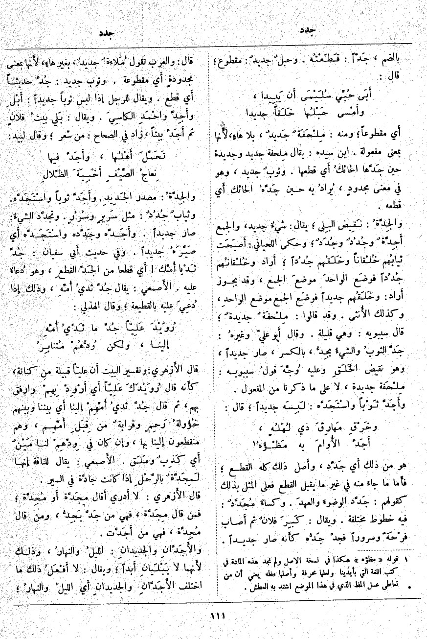 أَي مَقْطُوعًا؛ وَمِنْهُ: مِلْحَفَةٌ جديدٌ، بِلَا هاءٍ، لأَنها بِمَعْنَى مَفْعُولَةٍ. ابْنُ سِيدَهْ: يُقَالُ مِلحفة جَدِيدٌ وَجَدِيدَةٌ حِينَ جَدَّها الحائكُ أَي قَطَعَهَا. وثوبٌ جَدِيدٌ، وَهُوَ فِي مَعْنَى مجدودٍ، يُرادُ بِهِ حِينَ جَدَّهُ الْحَائِكُ أَي قَطَعَهُ. والجِدَّةُ: نَقِيض البِلى؛ يُقَالُ: شيءٌ جَدِيدٌ، وَالْجَمْعُ أَجِدَّةٌ وجُدُدٌ وجُدَدٌ؛ وَحَكَى اللِّحْيَانِيُّ: أَصبَحَت ثيابُهم خُلْقاناً وخَلَقُهم جُدُداً؛ أَراد وخُلْقانُهم جُدُداً فوضَع الواحدَ موضعَ الْجَمْعِ، وَقَدْ يَجُوزُ أَراد: وخَلَقُهم جَدِيدًا فوضَع الْجَمْعَ مَوْضِعَ الواحدِ، وَكَذَلِكَ الأُنثى. وَقَدْ قَالُوا: مِلْحفَةٌ جديدةٌ، قَالَ سِيبَوَيْهِ: وَهِيَ قَلِيلَةٌ. وَقَالَ أَبو عَلِيٍّ وغيرهُ: جَدَّ الثوبُ والشيءُ يجِدُّ، بِالْكَسْرِ، صَارَ جَدِيدًا، وَهُوَ نَقِيضُ الخَلَقِ وَعَلَيْهِ وُجِّهَ قولُ سِيبَوَيْهِ: مِلْحَفة جَدِيدَةٌ، لَا عَلَى مَا ذَكَرْنَا مِنَ الْمَفْعُولِ. وأَجَدَّ ثَوْباً واسْتَجَدَّه: لَبِسَه جَدِيدًا؛ قَالَ: