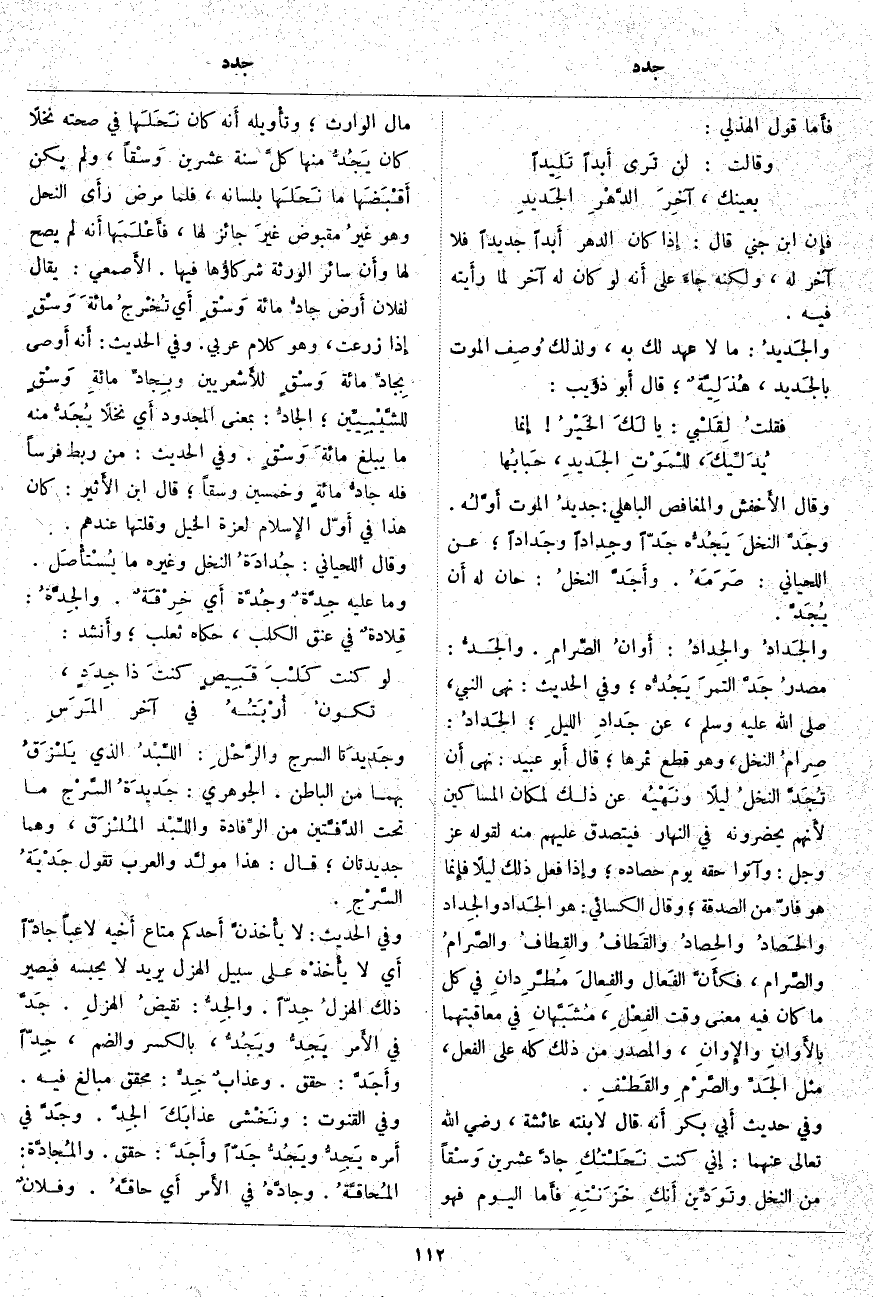 فإِن ابْنَ جِنِّيٍّ قَالَ: إِذا كَانَ الدَّهْرُ أَبداً جَدِيدًا فَلَا آخِرَ لَهُ، وَلَكِنَّهُ جاءَ عَلَى أَنه لَوْ كَانَ لَهُ آخِرٌ لَمَا رأَيته فِيهِ. والجَديدُ: مَا لَا عَهْدَ لَكَ بِهِ، وَلِذَلِكَ وُصِف الْمَوْتُ بالجَديد، هُذَلِيَّةٌ؛ قَالَ أَبو ذُؤَيْبٍ: