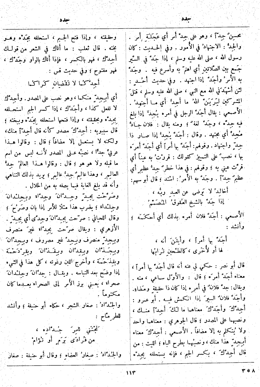 أَي أَبِجِدٍّ مِنْكُمَا، وَهُوَ نَصْبٌ عَلَى الْمَصْدَرِ. وأَ جِدَّك لا تفعل كذا، وأَ جَدَّك، إِذا كَسَرَ الْجِيمَ اسْتَحْلَفَهُ بِجِدِّه وَبِحَقِيقَتِهِ، وإِذا فَتَحَهَا اسْتَحْلَفَهُ بِجَدِّه وَبِبَخْتِهِ؛ قَالَ سِيبَوَيْهِ: أَجِدَّكَ مَصْدَرٌ كأَنه قَالَ أَجِدّاً مِنْكَ، وَلَكِنَّهُ لَا يُسْتَعْمَلُ إِلا مُضَافًا؛ قَالَ: وَقَالُوا هَذَا عربيٌّ جِدًّا، نصبُه عَلَى الْمَصْدَرِ لأَنه لَيْسَ مِنَ اسْمِ مَا قَبْلَهُ وَلَا هُوَ هُوَ؛ قَالَ: وَقَالُوا هَذَا العالمُ جِدُّ العالِمِ، وَهَذَا عالِمٌ جِدُّ عالِمٍ، يُرِيدُ بِذَلِكَ التَّنَاهِيَ وأَنه قَدْ بَلَغَ الْغَايَةَ فِيمَا يَصِفُهُ بِهِ مِنَ الْخِلَالِ. وصَرَّحْت بِجِدٍّ وجِدَّانَ وجِدَّاءَ وبِجِلْدانَ وجِلْداءَ؛ يُضْرَبُ هَذَا مَثَلًا للأَمر إِذا بَانَ وصَرُحَ؛ وَقَالَ اللِّحْيَانِيُّ: صَرَّحْتُ بِجِدَّانَ وجِدَّى أَي بِجِدٍّ. الأَزهري: وَيُقَالُ صَرَّحْتُ بِجِدَّاءَ غيرَ مُنْصَرِفٍ وبِجِدٍّ مُنْصَرِفٌ وبِجِدَّ غَيْرُ مَصْرُوفٍ، وبِجِدَّانَ وبِجَذَّان وبِقِدَّان وبِقَذَّانَ وبقِرْدَحْمَة وبقِذَحْمَة، وأَخرج اللَّبَنُ رَغْوَتَهُ، كُلُّ هَذَا فِي الشَّيْءِ إِذا وضَح بَعْدَ الْتِبَاسِهِ. وَيُقَالُ: جِدَّانَ وجِلْدانَ صحراءَ، يَعْنِي بَرَزَ الأَمر إِلى الصَّحْرَاءِ بعد ما كَانَ مَكْتُومًا. والجُدَّادُ: صِغَارُ الشَّجَرِ، حَكَاهُ أَبو حَنِيفَةَ؛ وأَنشد للطرِمَّاح: