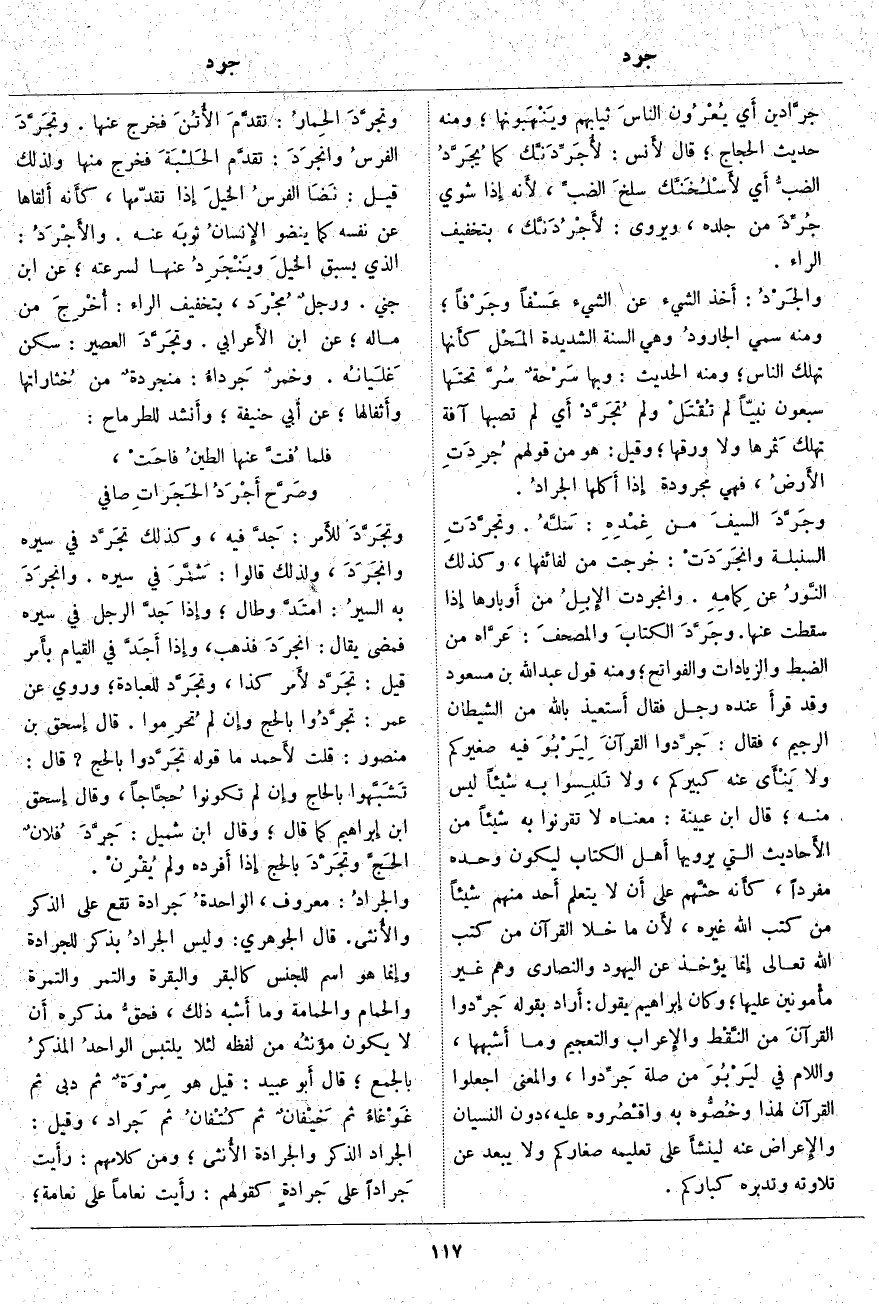 ؛ قَالَ ابْنُ عُيَيْنَةَ: مَعْنَاهُ لَا تَقْرِنُوا بِهِ شَيْئًا مِنَ الأَحاديث الَّتِي يَرْوِيهَا أَهل الْكِتَابِ لِيَكُونَ وَحْدَهُ مُفْرَدًا، كأَنه حثَّهم عَلَى أَن لَا يَتَعَلَّمَ أَحد مِنْهُمْ شَيْئًا مِنْ كُتُبِ اللَّهِ غَيْرَهُ، لأَن مَا خَلَا الْقُرْآنِ مِنْ كُتُبِ اللَّهِ تَعَالَى إِنما يُؤْخَذُ عَنِ الْيَهُودِ وَالنَّصَارَى وَهُمْ غَيْرُ مأْمونين عَلَيْهَا؛ وَكَانَ إِبراهيم يَقُولُ: أَراد بِقَوْلِهِ جَرِّدوا القرآنَ مِنَ النَّقْط والإِعراب وَالتَّعْجِيمِ وَمَا أَشبهها، وَاللَّامُ فِي ليَرْبُوَ مِنْ صِلَةِ جَرِّدوا، وَالْمَعْنَى اجْعَلُوا الْقُرْآنَ لِهَذَا وخُصُّوه بِهِ واقْصُروه عَلَيْهِ، دُونَ النِّسْيَانِ والإِعراض عَنْهُ لينشأَ عَلَى تَعْلِيمِهِ صِغَارُكُمْ وَلَا يَبْعُدَ عَنْ تِلَاوَتِهِ وَتَدَبُّرِهِ كِبَارُكُمْ. وتجرَّدَ الحِمارُ: تقدَّمَ الأُتُنَ فَخَرَجَ عَنْهَا. وتجَرَّدَ الفرسُ وانجرَدَ: تقدَّم الحَلْبَةَ فَخَرَجَ مِنْهَا وَلِذَلِكَ قِيلَ: نَضَا الفرسُ الخيلَ إِذا تَقَدَّمَهَا، كأَنه أَلقاها عَنْ نَفْسِهِ كَمَا يَنْضُو الإِنسانُ ثوبَه عَنْهُ. والأَجْرَدُ: الَّذِي يَسْبِقُ الخيلَ ويَنْجَرِدُ عَنْهَا لِسُرْعَتِهِ؛ عَنِ ابْنِ جِنِّيٍّ. ورجلٌ مُجْرَد، بِتَخْفِيفِ الرَّاءِ: أُخْرِجَ مِنْ مَالِهِ؛ عَنِ ابْنِ الأَعرابي. وتجَرَّدَ الْعَصِيرُ: سَكَنَ غَلَيانُه. وخمرٌ جَرداءُ: منجردةٌ مِنْ خُثاراتها وأَثفالها؛ عَنْ أَبي حَنِيفَةَ؛ وأَنشد لِلطِّرِمَّاحِ: