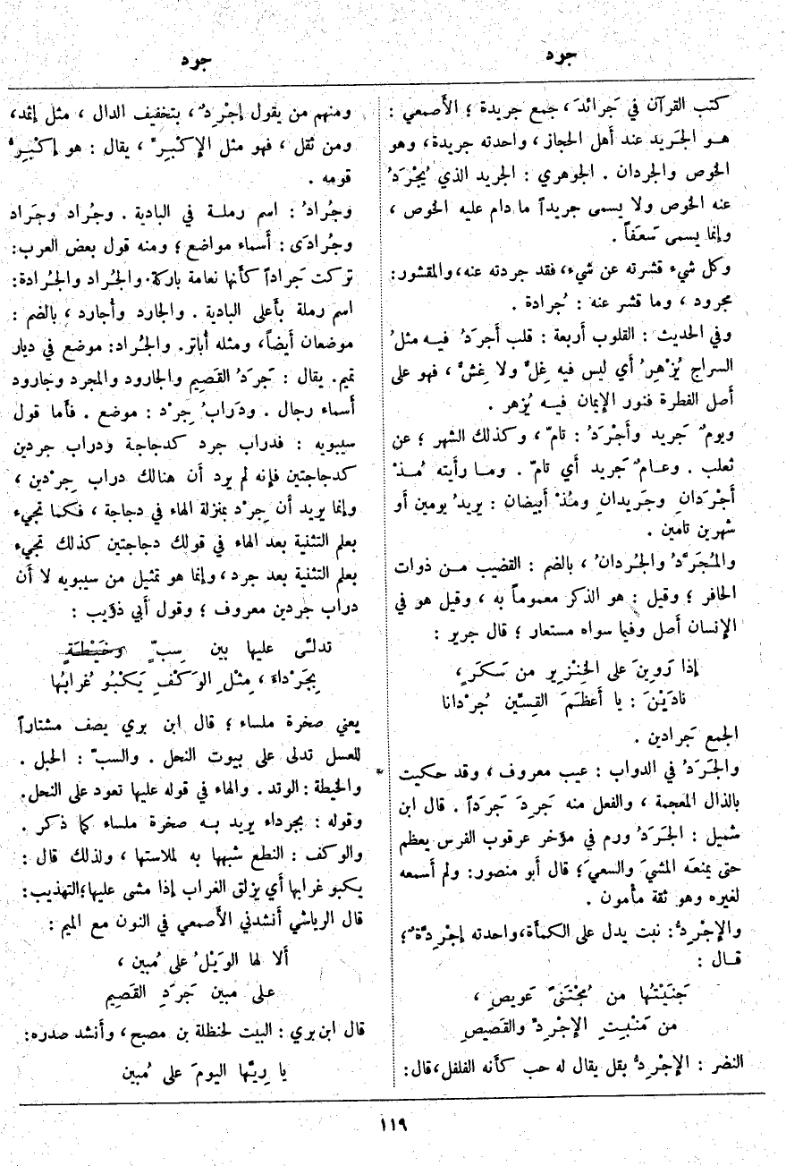 ، جَمْعُ جَرِيدَةٍ؛ الأَصمعي: هُوَ الجَريد عِنْدَ أَهل الْحِجَازِ، وَاحِدَتُهُ جَرِيدَةٌ، وَهُوَ الْخُوصُ وَالْجُرْدَانُ. الْجَوْهَرِيُّ: الْجَرِيدُ الَّذِي يُجْرَدُ عَنْهُ الْخُوصُ وَلَا يُسَمَّى جَرِيدًا مَا دَامَ عَلَيْهِ الْخُوصُ، وإِنما يُسَمَّى سَعَفاً. وَكُلُّ شَيْءٍ قَشَرْتَهُ عَنْ شَيْءٍ، فَقَدْ جَرَدْتَهُ عَنْهُ، وَالْمَقْشُورُ: مَجْرُودٌ، وَمَا قُشِرَ عَنْهُ: جُرادة. وَفِي الْحَدِيثِ: