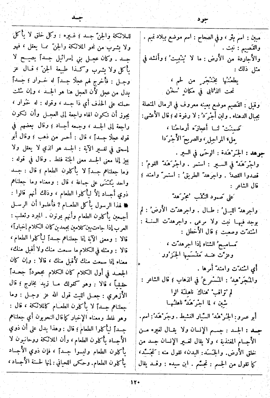 ؛ قَالَ: جَسَدٌ وَاحِدٌ يُثْنَى عَلَى جَمَاعَةٍ، قَالَ: وَمَعْنَاهُ وَمَا جَعَلْنَاهُمْ ذَوِي أَجساد إِلَّا ليأْكلوا الطَّعَامَ، وَذَلِكَ أَنهم قَالُوا: مَا لِهَذَا الرَّسُولِ يأْكل الطَّعَامَ؟ فأُعلموا أَن الرُّسُلَ أَجمعين يأْكلون الطَّعَامَ وأَنهم يَمُوتُونَ. الْمُبَرِّدُ وَثَعْلَبٌ: الْعَرَبُ إِذا جَاءَتْ بَيْنَ كَلَامَيْنِ بِجَحْدَيْنِ كَانَ الْكَلَامُ إِخباراً، قَالَا: وَمَعْنَى الْآيَةِ إِنما جَعَلْنَاهُمْ جَسَدًا ليأْكلوا الطَّعَامَ، قَالَا: وَمِثْلُهُ فِي الْكَلَامِ مَا سَمِعْتُ مِنْكَ وَلَا أَقبل مِنْكَ، مَعْنَاهُ إِنما سَمِعْتُ مِنْكَ لأَقبل مِنْكَ، قَالَا: وإِن كَانَ الْجَحْدُ فِي أَول الْكَلَامِ كَانَ الْكَلَامُ مَجْحُودًا جَحْدًا حَقِيقَيًّا، قَالَا: وَهُوَ كَقَوْلِكَ مَا زَيْدٌ بِخَارِجٍ؛ قَالَ الأَزهري: جَعَلَ اللَّيْثُ قَوْلَ اللَّهِ عَزَّ وَجَلَّ: وَما جَعَلْناهُمْ جَسَداً لَا يَأْكُلُونَ الطَّعامَ