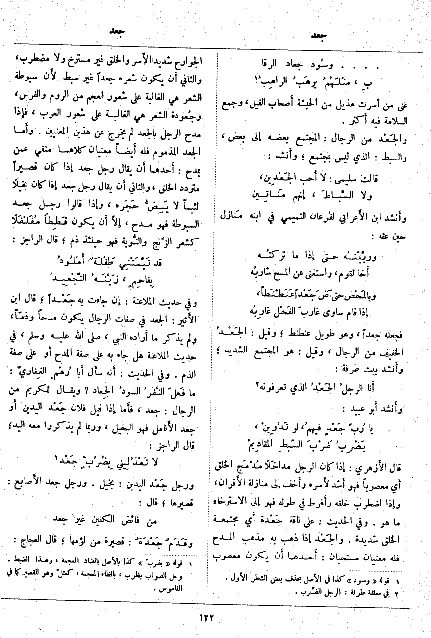 أَي مُجْتَمِعَةِ الْخَلْقِ شَدِيدَةٍ. والجَعْد إِذا ذَهَبَ بِهِ مَذْهَبَ الْمَدْحِ فَلَهُ مَعْنَيَانِ مُسْتَحَبَّانِ: أَحدهما أَن يَكُونَ مَعْصُوبَ الْجَوَارِحِ شَدِيدَ الأَسر وَالْخَلْقِ غَيْرَ مُسْتَرْخٍ وَلَا مُضْطَرِبٍ، وَالثَّانِي أَن يَكُونَ شَعْرُهُ جَعْدًا غَيْرَ سَبْطٍ لأَن سُبُوطَةَ الشَّعْرِ هِيَ الْغَالِبَةُ عَلَى شُعُورِ الْعَجَمِ مِنَ الرُّومِ وَالْفُرْسِ، وجُعودة الشَّعْرِ هِيَ الْغَالِبَةُ عَلَى شُعُورِ الْعَرَبِ، فإِذا مُدِحَ الرَّجُلُ بِالْجَعْدِ لَمْ يَخْرُجْ عَنْ هَذَيْنِ الْمَعْنَيَيْنِ. وأَما الْجَعْدُ الْمَذْمُومُ فَلَهُ أَيضاً مَعْنَيَانِ كِلَاهُمَا مَنْفِيٌّ عَمَّنْ يُمْدَحُ: أَحدهما أَن يُقَالَ رَجُلٌ جَعْدٌ إِذا كَانَ قَصِيرًا مُتَرَدِّدَ الْخَلْقِ، وَالثَّانِي أَن يُقَالَ رَجُلٌ جَعْدٌ إِذا كَانَ بَخِيلًا لَئِيمًا لَا يَبِضُّ حَجَره، وإِذا قَالُوا رَجُلٌ جَعْدُ السُّبُوطَةِ فَهُوَ مَدْحٌ، إِلَّا أَن يَكُونَ قَطِطاً مُفَلْفَلًا كَشَعْرِ الزَّنج والنُّوبة فَهُوَ حِينَئِذٍ ذَمٌّ؛ قَالَ الرَّاجِزُ: