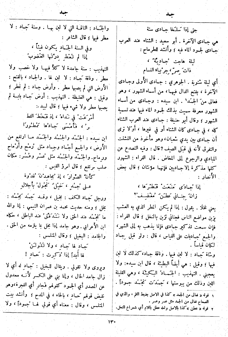 يَعْنِي نَخْلًا. يَقُولُ: إِذا لَمْ يَكُنِ الْمَطَرُ الَّذِي بِهِ الْعُشْبُ يُزَيِّنُ مَوَاضِعَ النَّاسِ فَجِنَانِي تُزَيَّنُ بِالنَّخْلِ؛ قَالَ الْفَرَّاءُ: فإِن سَمِعْتَ تَذْكِيرَ جُمَادَى فإِنما يَذْهَبُ بِهِ إِلى الشَّهْرِ، وَالْجَمْعُ جُماديات عَلَى الْقِيَاسِ، قَالَ: وَلَوْ قِيلَ جِماد لَكَانَ قِيَاسًا. وَشَاةٌ جَماد: لَا لَبَنَ فِيهَا. وَنَاقَةٌ جَمَادٌ، كَذَلِكَ لَا لَبَنَ فِيهَا؛ وَقِيلَ: هِيَ أَيضاً الْبَطِيئَةُ، قَالَ ابْنُ سِيدَهْ: وَلَا يُعْجِبُنِي: التَّهْذِيبُ: الجَمادُ البَكيئَة، وَهِيَ الْقَلِيلَةُ اللَّبَنِ وَذَلِكَ مِنْ يُبُوسَتِهَا، جَمَدَت تَجْمُد جُمُودًا. والجَماد: النَّاقَةُ الَّتِي لَا لَبَنَ بِهَا. وَسَنَةٌ جَماد: لَا مَطَرَ فِيهَا؛ قَالَ الشَّاعِرُ: