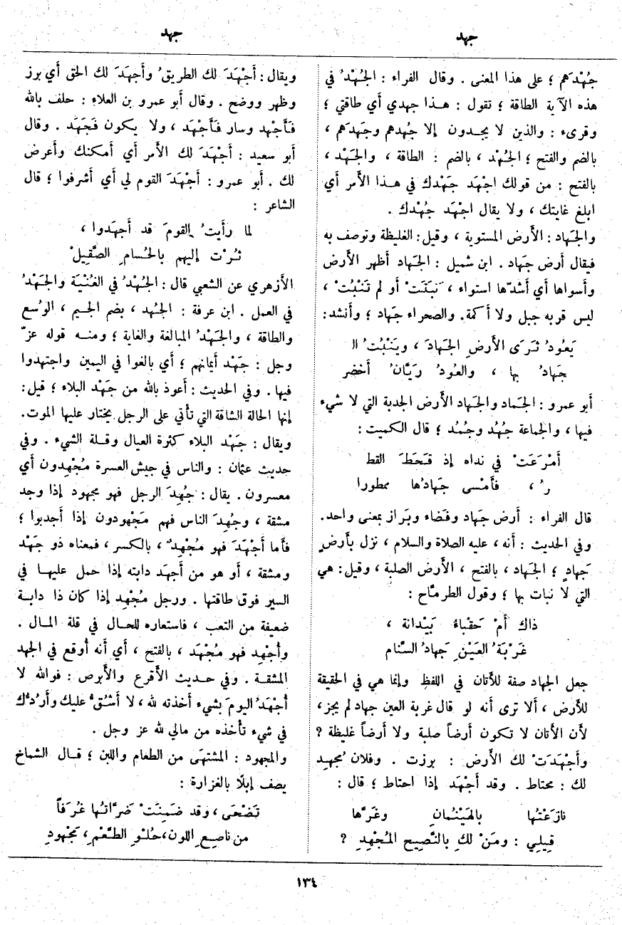 عَلَى هَذَا الْمَعْنَى. وَقَالَ الْفَرَّاءُ: الجُهْدُ فِي هَذِهِ الْآيَةِ الطَّاقَةُ؛ تَقُولُ: هَذَا جُهْدِي أَي طَاقَتِي؛ وَقُرِئَ: وَالَّذِينَ لَا يَجِدُونَ إِلا جُهدهم وجَهدَهم، بِالضَّمِّ وَالْفَتْحِ؛ الجُهْد، بِالضَّمِّ: الطَّاقَةُ، والجَهْد، بِالْفَتْحِ: مِنْ قَوْلِكِ اجْهَد جَهْدك فِي هَذَا الأَمر أَي ابْلُغْ غَايَتَكَ، وَلَا يُقَالُ اجْهَد جُهْدك. والجَهاد: الأَرض الْمُسْتَوِيَةُ، وَقِيلَ: الْغَلِيظَةُ وَتُوصَفُ بِهِ فَيُقَالُ أَرض جَهاد. ابْنُ شُمَيْلٍ: الجَهاد أَظهر الأَرض وأَسواها أَي أَشدّها اسْتِوَاءً، نَبَتَتْ أَو لَمْ تَنْبُتْ، ليس قُرْبَهُ جَبَلٌ وَلَا أَكمة. وَالصَّحْرَاءُ جَهاد؛ وأَنشد: