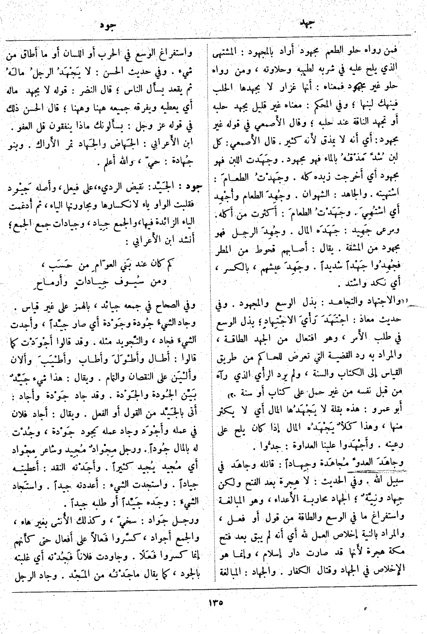 ؛ بَذَلَ الْوُسْعَ فِي طَلَبِ الأَمر، وَهُوَ افْتِعَالٌ مِنَ الْجُهْدِ الطَّاقَةِ، وَالْمُرَادُ بِهِ رَدُّ الْقَضِيَّةِ الَّتِي تَعْرِضُ لِلْحَاكِمِ مِنْ طَرِيقِ الْقِيَاسِ إِلى الْكِتَابِ وَالسُّنَّةِ، وَلَمْ يُرِدِ الرأْي الَّذِي رَآهُ مِنْ قِبَلِ نَفْسِهِ مِنْ غَيْرِ حَمْلٍ عَلَى كِتَابٍ أَو سُنَّةٍ. أَبو عَمْرٍو: هَذِهِ بَقْلَةٌ لَا يَجْهَدُها الْمَالُ أَي لَا يُكْثِرُ مِنْهَا، وَهَذَا كَلأٌ يَجْهَدُه الْمَالُ إِذا كَانَ يُلِحُّ عَلَى رَعِيَّتِهِ. وأَجْهَدوا عَلَيْنَا الْعَدَاوَةَ: جدُّوا. وجاهَدَ العدوَّ مُجاهَدة وجِهاداً: قَاتَلَهُ وجاهَد فِي سَبِيلِ اللَّهِ. وَفِي الْحَدِيثِ: