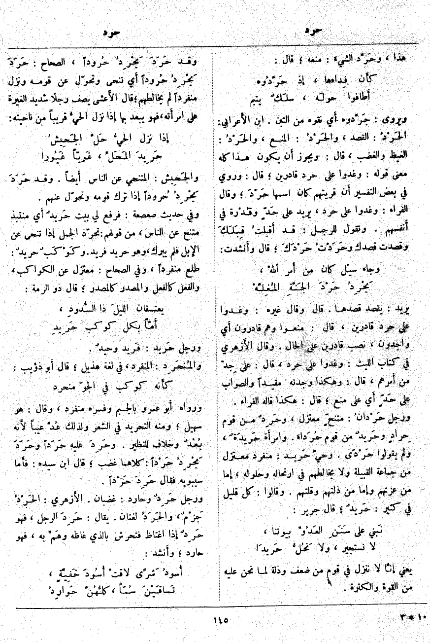 يُرِيدُ: يَقْصِدُ قَصْدَهَا. قَالَ وَقَالَ غَيْرُهُ: وَغَدَوْا عَلَى حَرْدٍ قَادِرِينَ، قَالَ: مَنَعُوا وَهُمْ قَادِرُونَ أَي وَاجِدُونَ، نُصِبَ قَادِرِينَ عَلَى الْحَالِ. وَقَالَ الأَزهري فِي كِتَابِ اللَّيْثِ: وَغَدَوْا عَلَى حَرْدٍ، قَالَ: عَلَى جِدٍّ مِنْ أَمرهم، قَالَ: وَهَكَذَا وَجَدْتُهُ مُقَيَّدًا وَالصَّوَابُ عَلَى حَدٍّ أَي عَلَى مَنْعٍ؛ قَالَ: هَكَذَا قَالَهُ الْفَرَّاءُ. وَرَجُلٌ حَرْدانُ: متنحٍّ مُعْتَزِلٌ، وحَرِدٌ مِنْ قَوْمٍ حِرادٍ وحَريدٌ مِنْ قَوْمٍ حُرَداءَ. وامرأَة حَريدَةٌ، وَلَمْ يَقُولُوا حَرْدَى. وَحَيٌّ حَريد: مُنْفَرِدٌ مُعْتَزِلٌ مِنْ جَمَاعَةِ الْقَبِيلَةِ وَلَا يُخَالِطُهُمْ فِي ارْتِحَالِهِ وَحُلُولِهِ، إِما مِنْ عِزَّتِهِمْ وإِما مِنْ ذِلَّتِهِمْ وَقِلَّتِهِمْ. وَقَالُوا: كُلُّ قَلِيلٍ فِي كَثِيرٍ: حَريدٌ؛ قَالَ جَرِيرٌ:
