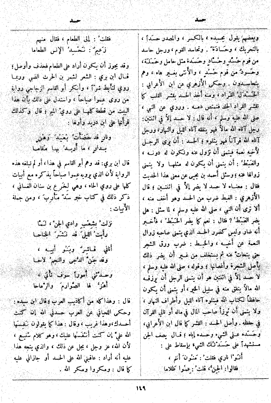 قَالَ: وَهَذَا كُلُّهُ مِنْ أَكاذيب الْعَرَبِ؛ قَالَ ابْنُ سِيدَهْ: وَحَكَى اللِّحْيَانِيُّ عَنِ الْعَرَبِ حَسَدَنِي اللَّهُ إِن كُنْتُ أَحسدك، وَهَذَا غَرِيبٌ، وَقَالَ: هَذَا كَمَا يَقُولُونَ نَفِسَها اللَّهُ عليَّ إِن كُنْتُ أَنْفَسُها عَلَيْكَ، وَهُوَ كَلَامٌ شَنِيعٌ، لأَن اللَّهَ، عَزَّ وَجَلَّ، يَجِلُّ عَنْ ذَلِكَ، وَالَّذِي يَتَّجِهُ هَذَا عَلَيْهِ أَنه أَراد: عَاقَبَنِي اللَّهُ عَلَى الْحَسَدِ أَو جَازَانِي عَلَيْهِ كَمَا قَالَ: وَمَكَرُوا وَمَكَرَ اللَّهُ.