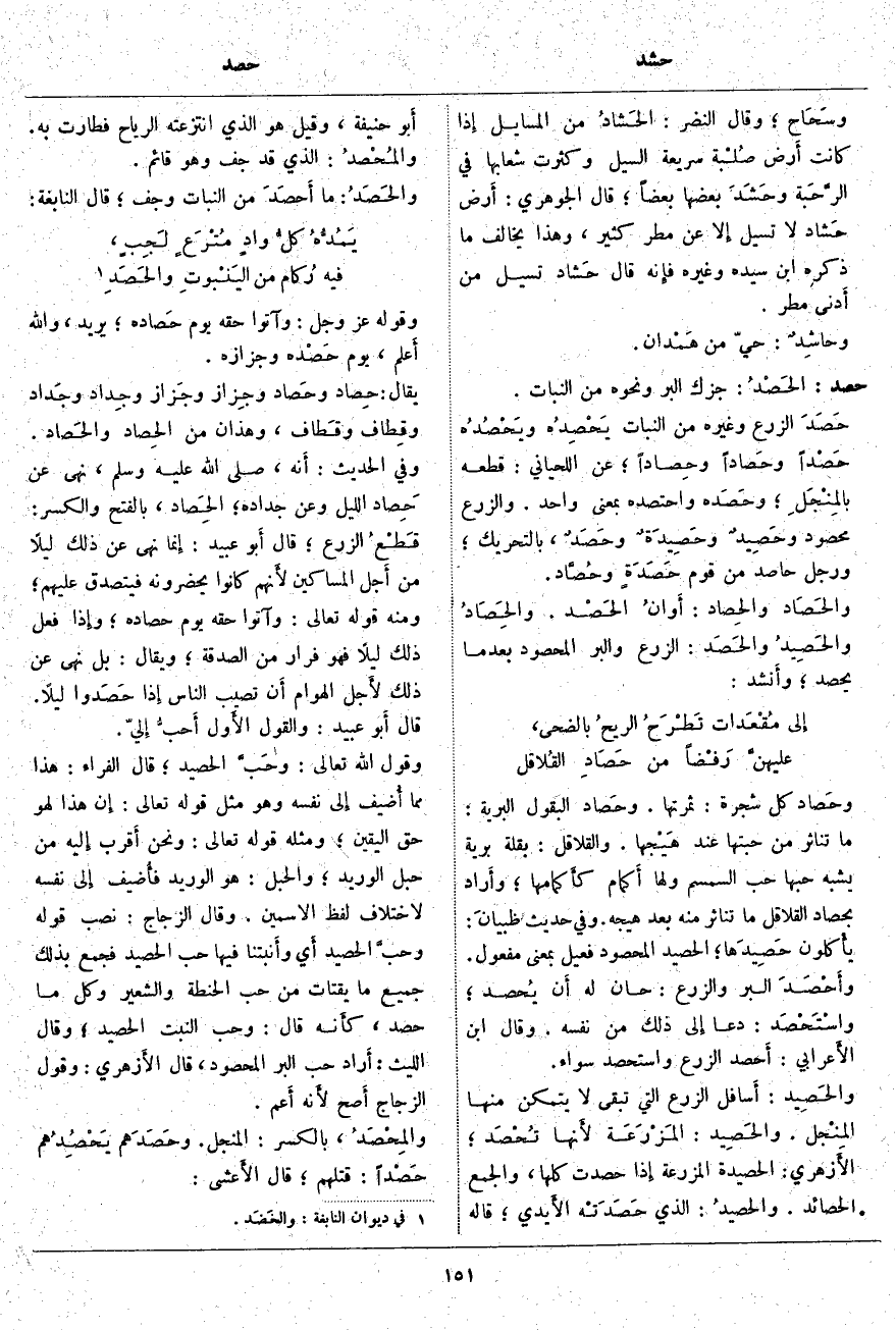 حصد: الحَصْدُ: جَزُّكَ الْبُرَّ وَنَحْوَهُ مِنَ النَّبَاتِ. حَصَدَ الزَّرْعَ وَغَيْرَهُ مِنَ النَّبَاتِ يَحْصِدُه ويَحْصُدُه حَصْداً وحَصاداً وحِصاداً؛ عَنِ اللِّحْيَانِيِّ: قَطَعَهُ بالمِنْجَلِ؛ وحَصَده وَاحْتَصَدَهُ بِمَعْنًى وَاحِدٍ. وَالزَّرْعُ مَحْصُودٌ وحَصِيدٌ وحَصِيدَةٌ وحَصَدٌ، بِالتَّحْرِيكِ؛ وَرَجُلٌ حَاصِدٌ مِنْ قَوْمٍ حَصَدةٍ وحُصَّاد. والحَصَاد والحِصاد: أَوانُ الحَصْد. والحَصَادُ والحَصِيدُ والحَصَد: الزرع والبر المحصود بعد ما يُحْصَدُ؛ وأَنشد: