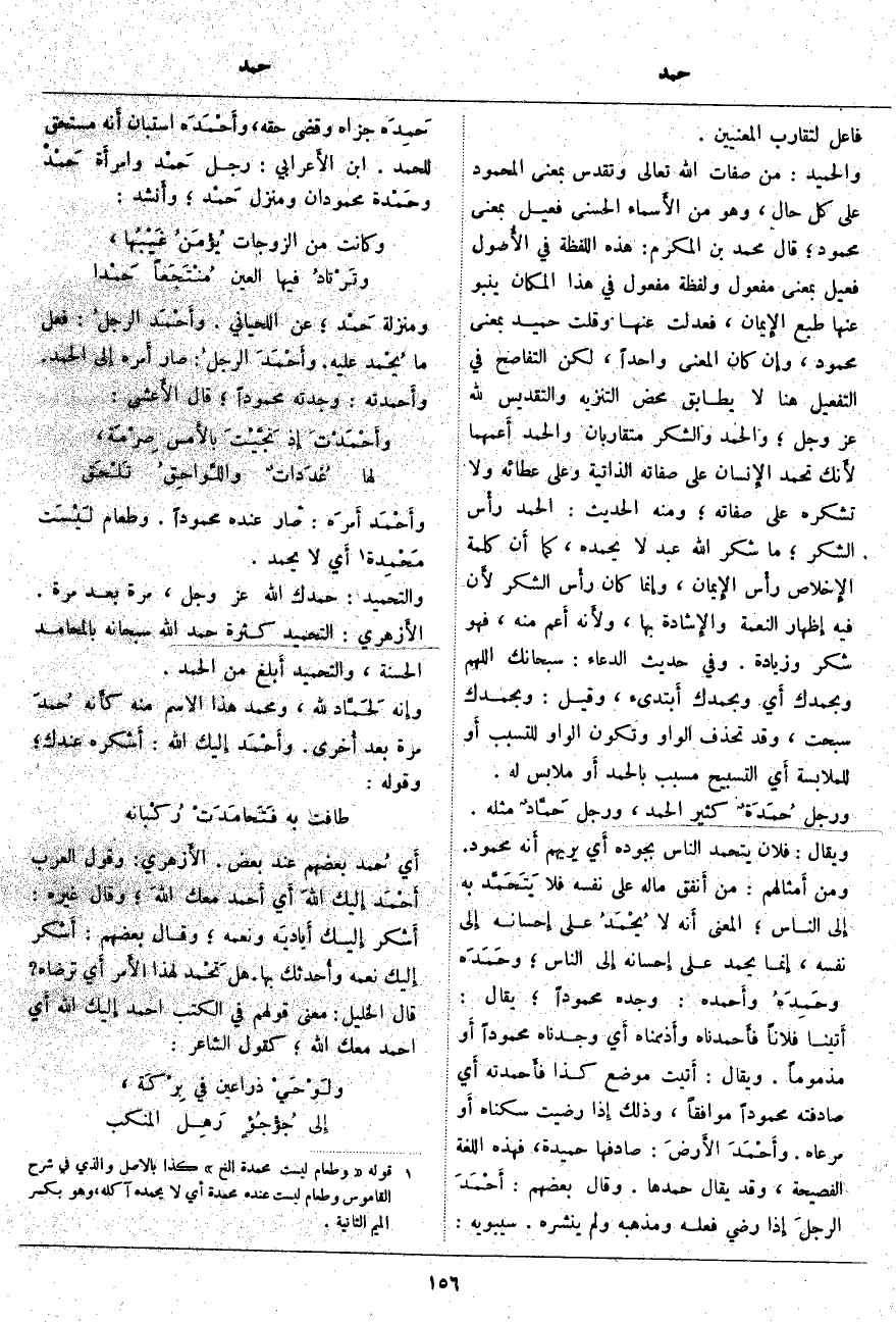 فَاعِلٍ لِتَقَارُبِ الْمَعْنَيَيْنِ. وَالْحَمِيدُ: مِنْ صِفَاتِ اللَّهِ تَعَالَى وَتَقَدَّسَ بِمَعْنَى الْمَحْمُودِ عَلَى كُلِّ حَالٍ، وَهُوَ مِنَ الأَسماء الْحُسْنَى فَعِيلٌ بِمَعْنَى مَحْمُودٍ؛ قَالَ مُحَمَّدُ بْنُ الْمُكَرَّمِ: هَذِهِ اللَّفْظَةُ فِي الأُصول فَعِيلٌ بِمَعْنَى مَفْعُولٍ وَلَفْظَةُ مَفْعُولٍ فِي هَذَا الْمَكَانِ يَنْبُو عَنْهَا طَبْعُ الإِيمان، فَعَدَلْتُ عَنْهَا وَقُلْتُ حَمِيدٌ بِمَعْنَى مَحْمُودٍ، وإِن كَانَ الْمَعْنَى وَاحِدًا، لَكِنَّ التَّفَاصُحَ فِي التَّفْعِيلِ هُنَا لَا يُطَابِقُ مَحْضَ التَّنْزِيهِ وَالتَّقْدِيسِ لِلَّهِ عَزَّ وَجَلَّ؛ وَالْحَمْدُ وَالشُّكْرُ مُتَقَارِبَانِ وَالْحَمْدُ أَعمهما لأَنك تَحْمَدُ الإِنسان عَلَى صِفَاتِهِ الذَّاتِيَّةِ وَعَلَى عَطَائِهِ وَلَا تَشْكُرُهُ عَلَى صِفَاتِهِ؛ وَمِنْهُ الْحَدِيثُ: