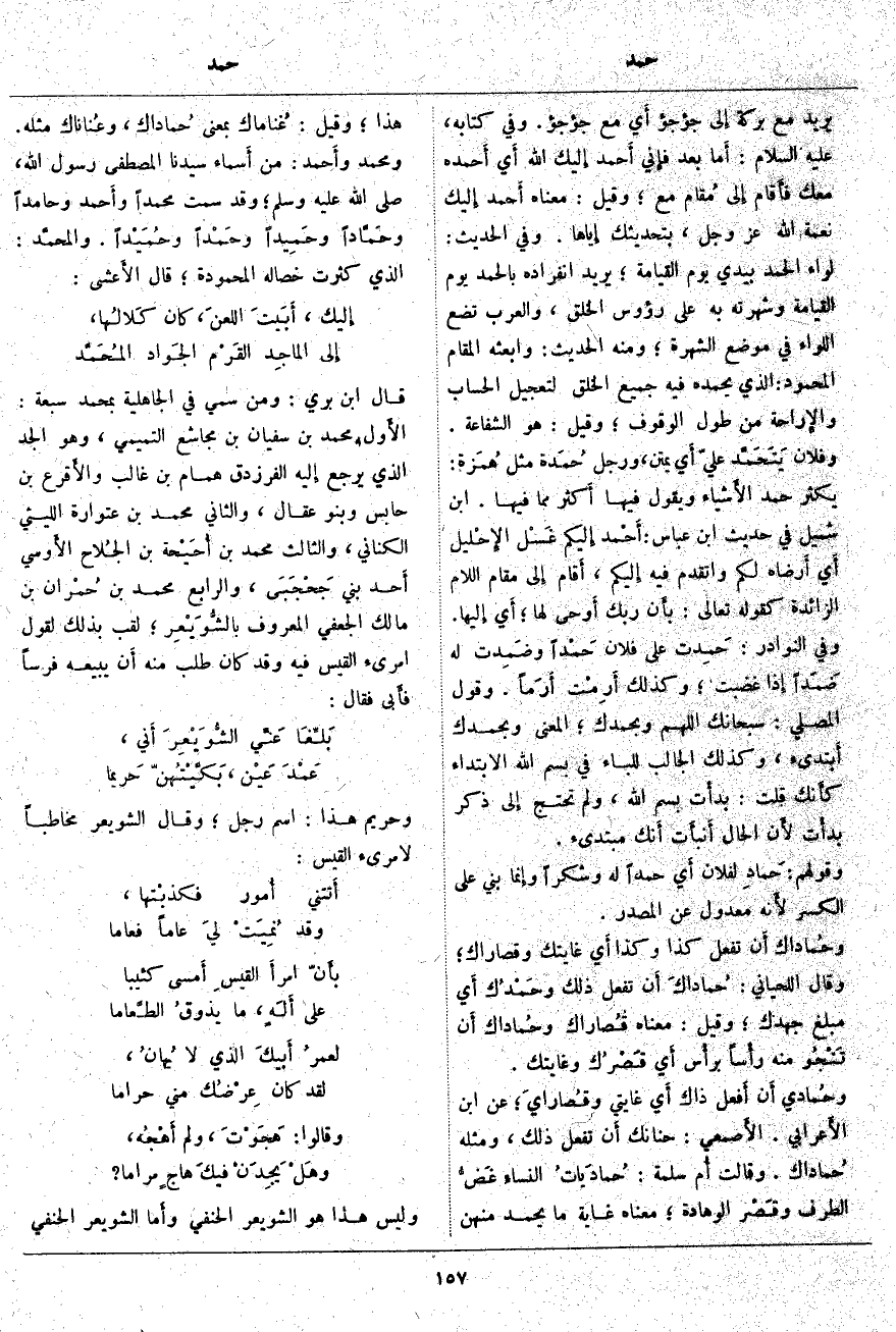 أَي أَرضاه لَكُمْ وَأَتَقَدَّمُ فِيهِ إِليكم، أَقام إِلى مُقَامَ اللَّامِ الزَّائِدَةِ كَقَوْلِهِ تَعَالَى: بِأَنَّ رَبَّكَ أَوْحى لَها؛ أَي إِليها. وَفِي النَّوَادِرِ: حَمِدت عَلَى فُلَانٍ حَمْداً وضَمِدت لَهُ ضَمَداً إِذا غَضِبْتَ؛ وَكَذَلِكَ أَرِمْت أَرَماً. وَقَوْلُ الْمُصَلِّي: سُبْحَانَكَ اللَّهُمَّ وَبِحَمْدِكَ؛ الْمَعْنَى وَبِحَمْدِكَ أَبتدئ، وَكَذَلِكَ الْجَالِبُ لِلْبَاءِ فِي بِسْمِ اللَّهِ الِابْتِدَاءُ كأَنك قُلْتَ: بدأْت بِسْمِ اللَّهِ، وَلَمْ تَحْتَجْ إِلى ذِكْرِ بدأْت لأَن الْحَالَ أَنبأَت أَنك مُبْتَدِئٌ. وَقَوْلُهُمْ: حَمادِ لِفُلَانٍ أَي حَمْدًا لَهُ وَشُكْرًا وإِنما بُنِيَ عَلَى الْكَسْرِ لأَنه مَعْدُولٌ عَنِ الْمَصْدَرِ. وحُماداك أَن تَفْعَلَ كَذَا وَكَذَا أَي غَايَتُكَ وَقُصَارَاكَ؛ وَقَالَ اللِّحْيَانِيُّ: حُماداكَ أَن تَفْعَلَ ذَلِكَ وحَمْدُك أَي مَبْلَغُ جَهْدِكَ؛ وَقِيلَ: مَعْنَاهُ قُصاراك وحُماداك أَن تَنْجُو مِنْهُ رأْساً برأْس أَي قَصْرُك وَغَايَتُكَ. وحُمادي أَن أَفعل ذَاكَ أَي غَايَتِي وقُصارايَ؛ عَنِ ابْنِ الأَعرابي. الأَصمعي: حَنَانُكَ أَن تَفْعَلَ ذَلِكَ، وَمِثْلُهُ حُماداك. وَقَالَتْ