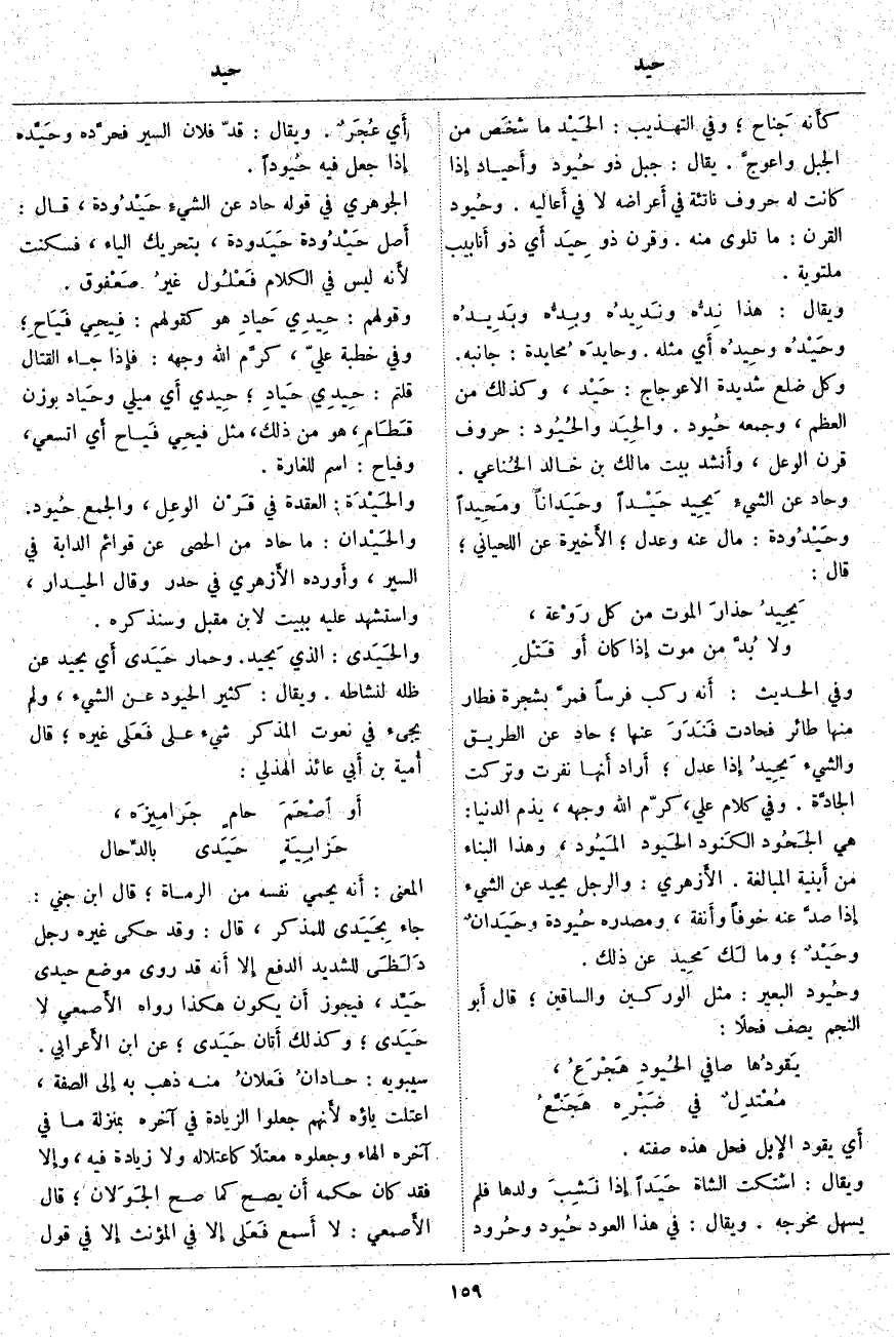 أَي يَقُودُ الإِبل فَحْلٌ هَذِهِ صِفَتُهُ. وَيُقَالُ: اشْتَكَتِ الشَّاةُ حَيَداً إِذا نَشِبَ وَلَدُهَا فَلَمْ يَسْهُلْ مَخْرَجُهُ. وَيُقَالُ: فِي هَذَا الْعُودِ حُيود وحُرود أَي عُجَرٌ. وَيُقَالُ: قَدَّ فُلَانٌ السَّيْرَ فحرَّده وحَيَّده إِذا جَعَلَ فِيهِ حُيوداً. الْجَوْهَرِيُّ فِي قَوْلِهِ حَادَ عَنِ الشيءِ حَيْدُودة، قَالَ: أَصل حَيْدُودة حَيَدودة، بِتَحْرِيكِ الْيَاءِ، فَسَكَنَتْ لأَنه لَيْسَ فِي الْكَلَامِ فَعْلُول غيرُ صَعْفوق. وَقَوْلُهُمْ: حِيدِي حَيادِ هُوَ كَقَوْلِهِمْ: فِيحِي فَيَاحِ؛ وَفِي خُطْبَةِ